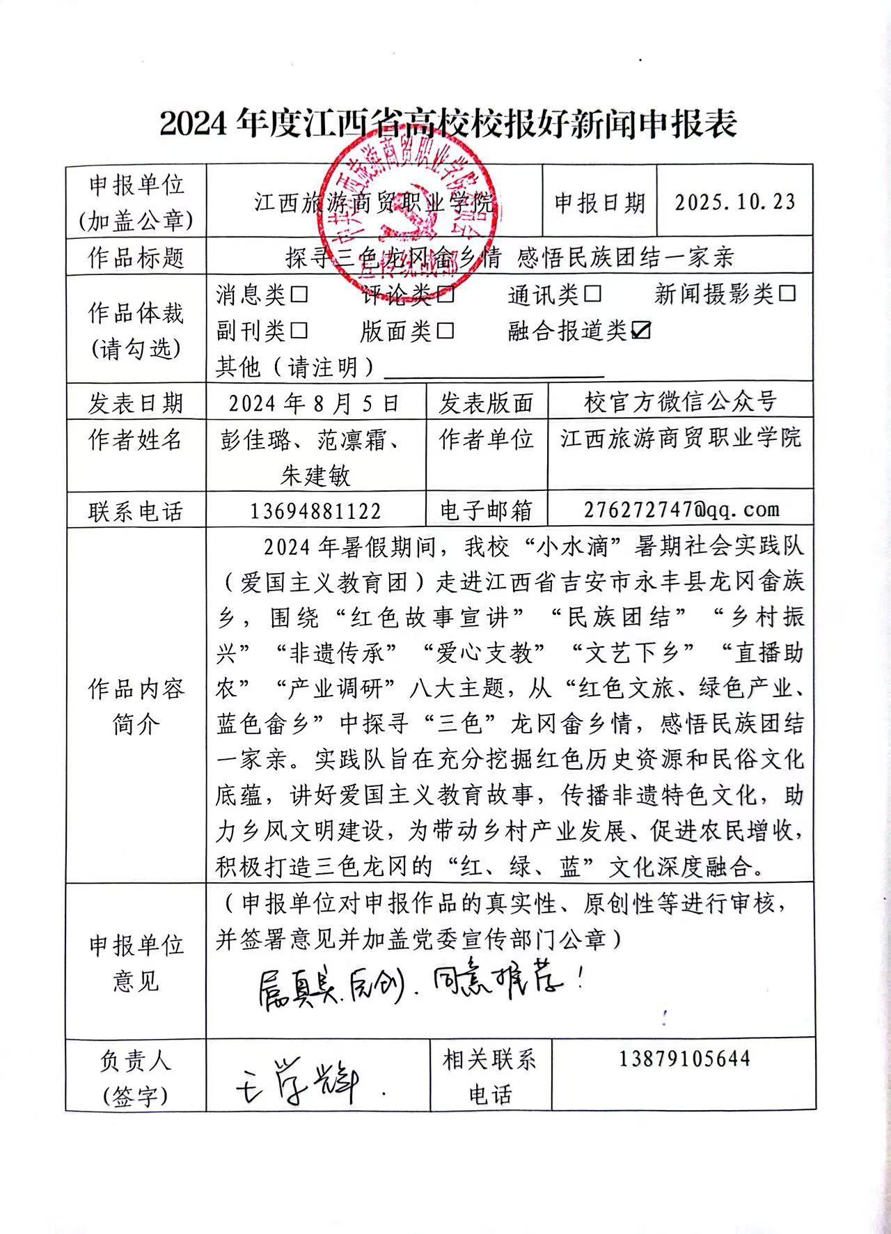 2024年暑假期间,我校“小水滴”暑期社会实践队(爱国主义教育团)走进江西省吉安市永丰县龙冈畲族乡,围绕“红色故事宣讲”“民族团结”“乡村振兴”“非遗传承”“爱心支教”“文艺下乡”“直播助农”“产业调研”八大主题,从“红色文旅、绿色产业、蓝色畲乡”中探寻“三色”龙冈畲乡情,感悟民族团结一家亲。实践队旨在充分挖掘红色历史资源和民俗文化底蕴,讲好爱国主义教育故事,传播非遗特色文化,助力乡风文明建设,为带动乡村产业发展、促进农民增收,积极打造三色龙冈的“红、绿、蓝”文化深度融合。
