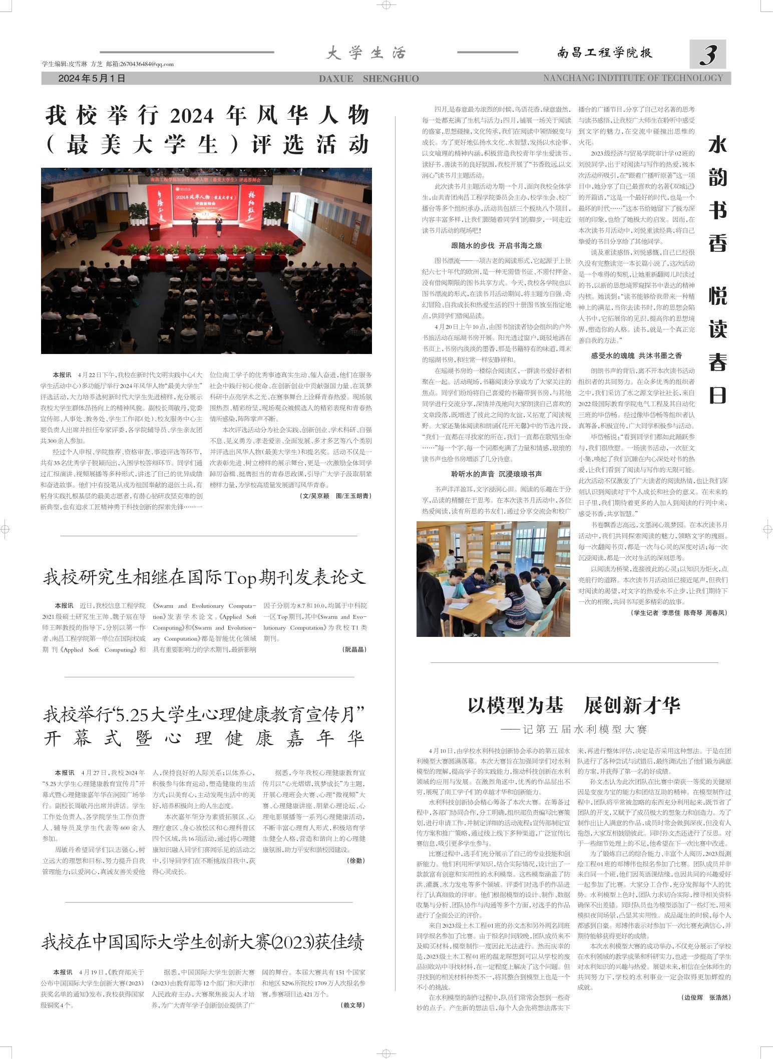 此次读书月主题活动为期一个月,面向我校全体学生,由共青团南昌工程学院委员会主办,校学生会、校广播台等多个组织承办,活动共包括三个板块八个项目,内容丰富多样,让我们跟随着同学们的脚步,一同走近读书月活动的现场吧!