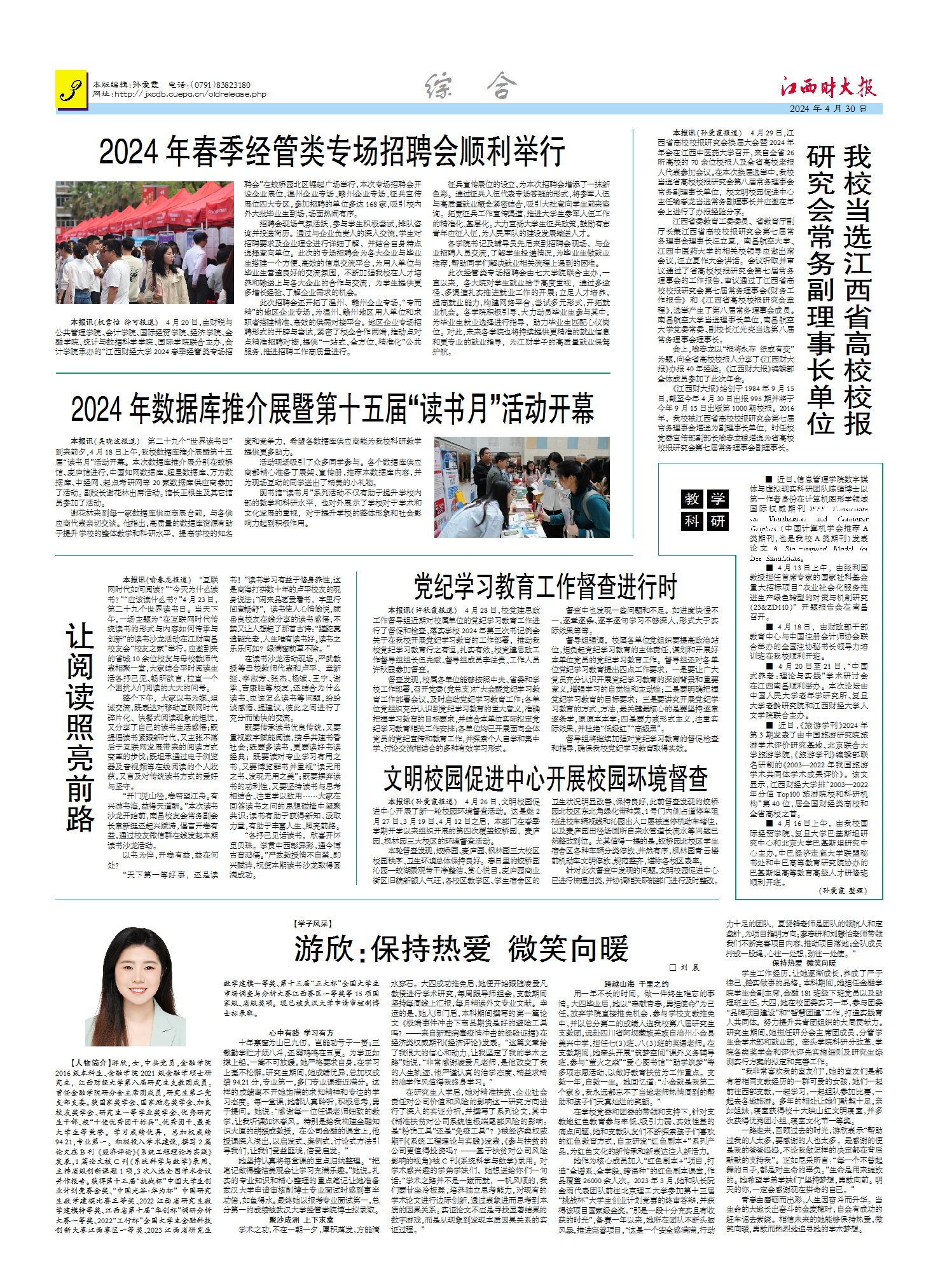 【人物简介】游欣,女,中共党员,金融学院2016级本科生、金融学院2021级金融学硕士研究生,江西财经大学第八届研究生支教团成员。曾任金融学院研分会主席团成员,研究生第二党支部支委。获国家奖学金、国家励志奖学金、加良校友奖学金、研究生一等学业奖学金、优秀研究生干部、校“十佳优秀团干标兵”、优秀团干、最美大学生等荣誉。学习成绩优异,总加权成绩94.21,专业第一。积极投入学术建设,撰写2篇论文在B刊《经济评论》《系统工程理论与实践》发表,1篇论文被C刊《系统科学与数学》录用,主持省级创新课题1项,3次入选全国学术会议并作报告。获得第十三届“挑战杯”中国大学生创业计划竞赛金奖、“中国光谷·华为杯”中国研究生数学建模比赛三等奖、2022江西省研究生数学建模特等奖、江西省第十届“华创杯”调研分析大赛一等奖、2022“工行杯”全国大学生金融科技创新大赛江西赛区一等奖、2023江西省研究生数学建模一等奖、第十三届“正大杯”全国大学生市场调查与分析大赛江西赛区一等奖等15项国家级、省级奖项。现已被武汉大学申请审核制博士拟录取。