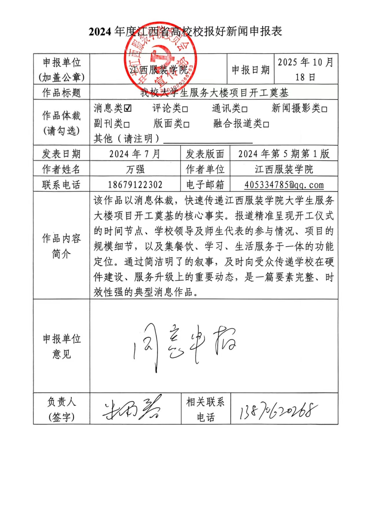 5 月 29 日上午 9 时18 分, 我校举行了大学生服务大楼奠基仪式。 理事长涂燕萍,党委书记、省政府督导专员陈付龙等校领导出席奠基仪式,各部门负责人及师生代表共 80 余人参加仪式。 仪式由校区建设委员会主任徐炜主持。理事长涂燕萍致辞。 她指出,历经两代人的不懈努力, 江西服装学院在这片广袤的土地上扎根、 生长, 如今已占地1300 余亩,成为一方教育的沃土。 大学生服务大楼这座即将崛起的建筑, 将成为江服校园内一道亮丽的风景线。 它不仅是一座功能齐全、设施先进的大楼,更是江服人用心用情服务师生的生动体现。