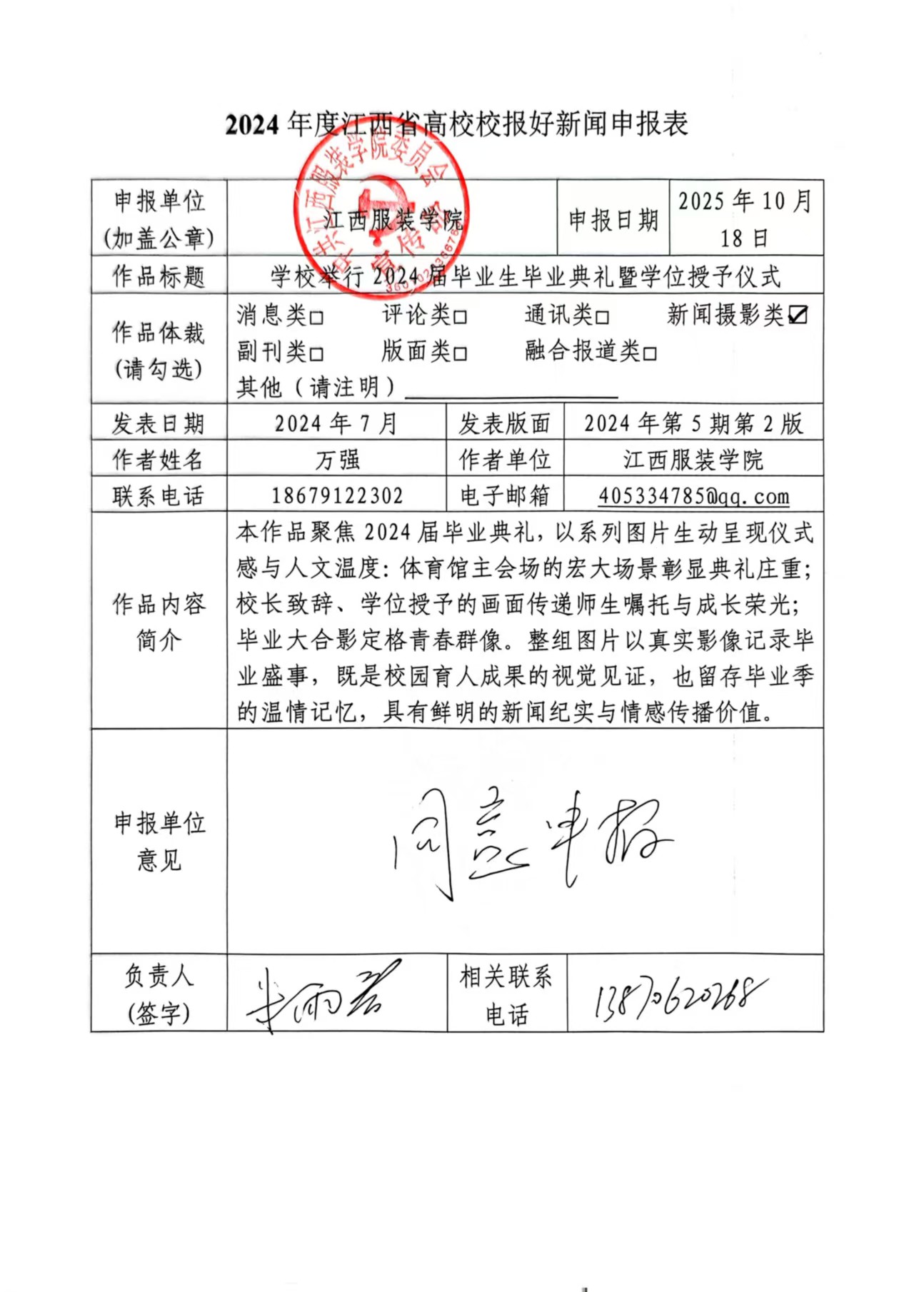 本作品聚焦2024届毕业典礼,以系列图片生动呈现仪式 感与人文温度:体育馆主会场的宏大场景彰显典礼庄重; 校长致辞、学位授予的画面传递师生嘱托与成长荣光; 毕业大合影定格青春群像。整组图片以真实影像记录毕 业盛事,既是校园育人成果的视觉见证,也留存毕业季 的温情记忆,具有鲜明的新闻纪实与情感传播价值。