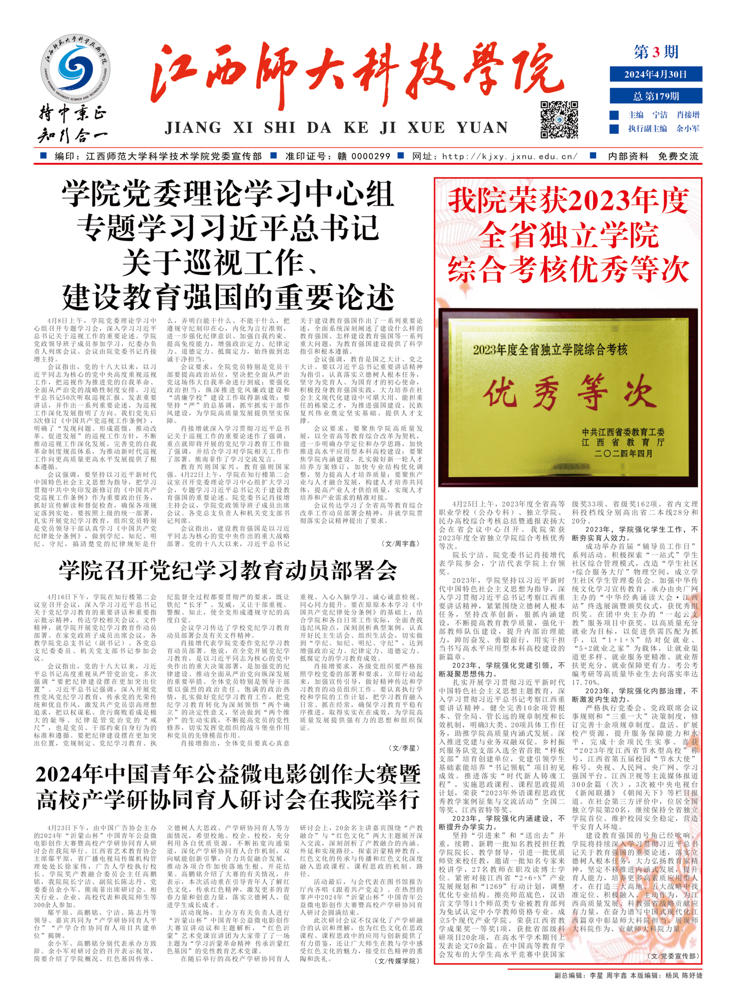 建设教育强国的号角已经吹响。学院将持续深入学习贯彻习近平总书记关于教育强国的重要论述,落实立德树人根本任务,大力弘扬教育家精神,坚定不移推进内涵式发展,提升育人能力,培养更多高素质应用型人才,在打造三大高地、五大战略中找准定位、积极融入、主动作为,为江西高质量发展、科教强省战略贡献应有力量,在奋力谱写中国式现代化江西篇章中彰显师大科院担当、展现师大科院作为、贡献师大科院力量。