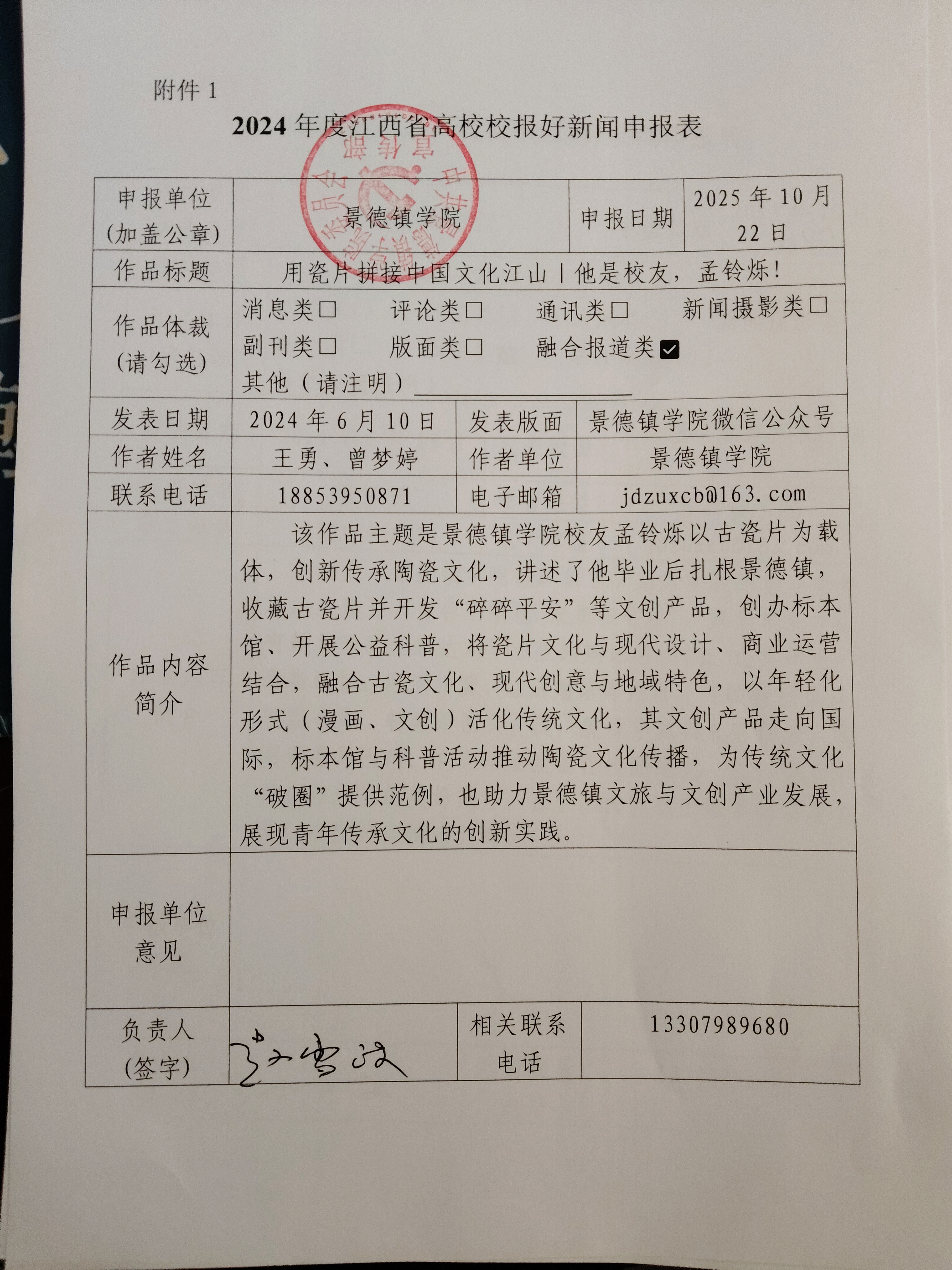 该作品主题是景德镇学院校友孟铃烁以古瓷片为载体,创新传承陶瓷文化。 该作品主题是景德镇学院校友孟铃烁以古瓷片为载体,创新传承陶瓷文化,讲述了他毕业后扎根景德镇,收藏古瓷片并开发“碎碎平安”等文创产品,创办标本馆、开展公益科普,将瓷片文化与现代设计、商业运营结合,融合古瓷文化、现代创意与地域特色,以年轻化形式(漫画、文创)活化传统文化,其文创产品走向国际,标本馆与科普活动推动陶瓷文化传播,为传统文化“破圈”提供范例,也助力景德镇文旅与文创产业发展,展现青年传承文化的创新实践。