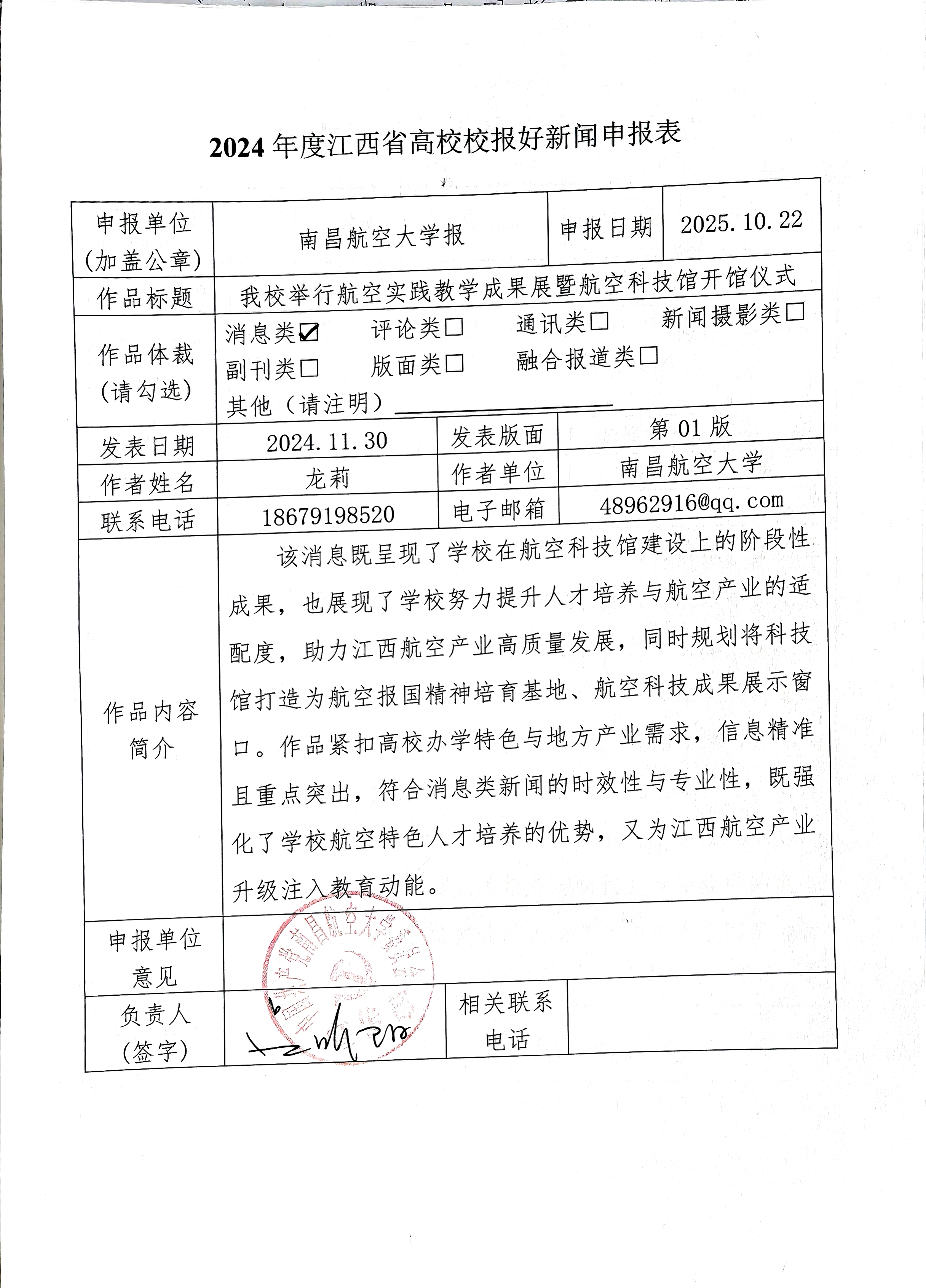 该消息既呈现了学校在航空科技馆建设上的阶段性成果,也展现了学校努力提升人才培养与航空产业的适配度,助力江西航空产业高质量发展,同时规划将科技馆打造为航空报国精神培育基地、航空科技成果展示窗口。作品紧扣高校办学特色与地方产业需求,信息精准且重点突出,符合消息类新闻的时效性与专业性,既强化了学校航空特色人才培养的优势,又为江西航空产业升级注入教育动能。
