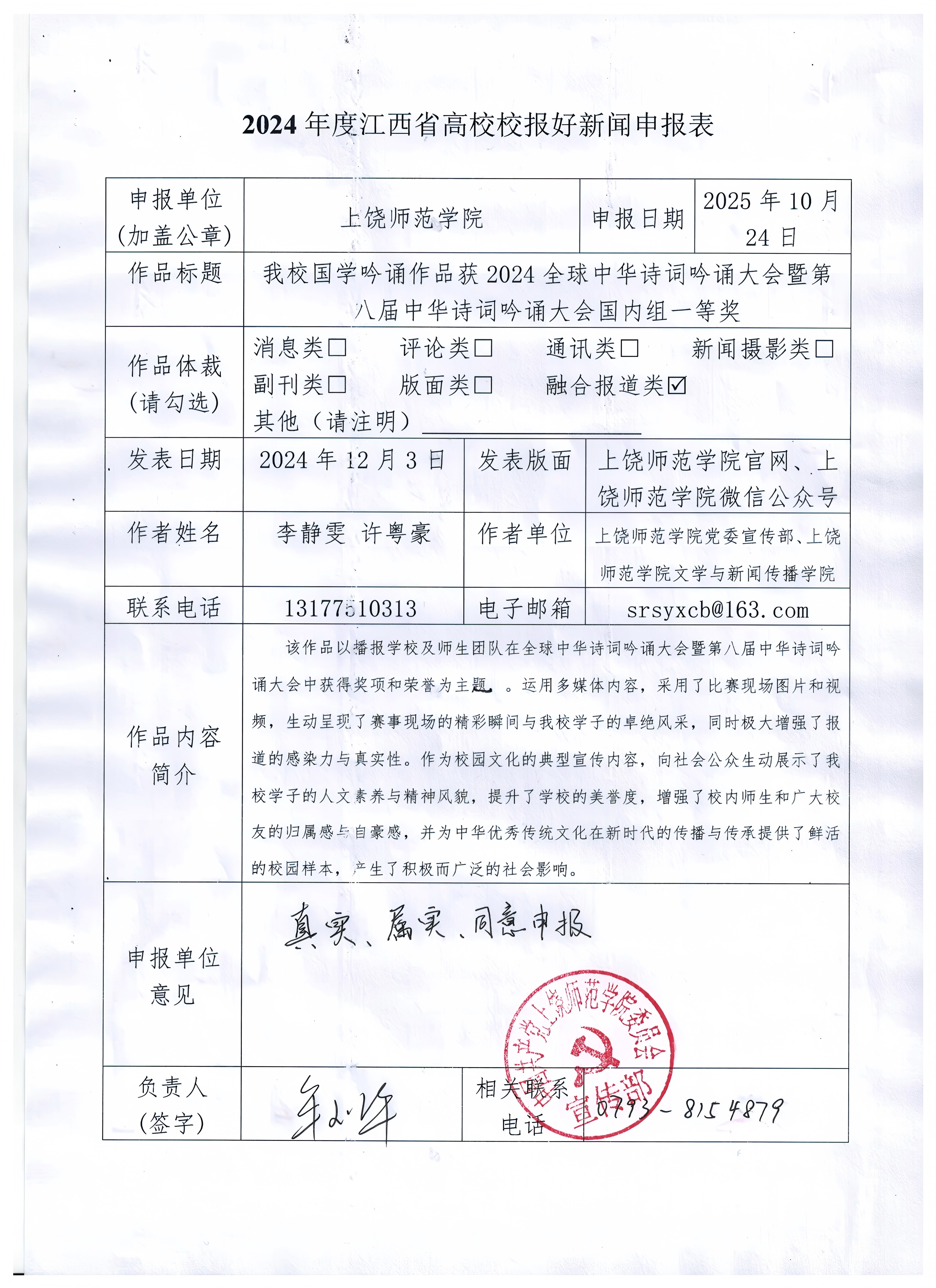 该作品以播报学校及师生团队在全球中华诗词吟诵大会暨第八届中华诗词吟诵大会中获得奖项和荣誉为主题。运用多媒体内容,采用了比赛现场图片和视频,生动呈现了赛事现场的精彩瞬间与我校学子的卓绝风采,同时极大增强了报 道的感染力与真实性。作为校园文化的典型宣传内容,向社会公众生动展示了我 校学子的人文素养与精神风貌,提升了学校的美誉度,增强了校内师生和广大校友的归属感与自豪感,并为中华优秀传统文化在新时代的传播与传承提供了鲜活的校园样本,产生了积极而广泛的社会影响。