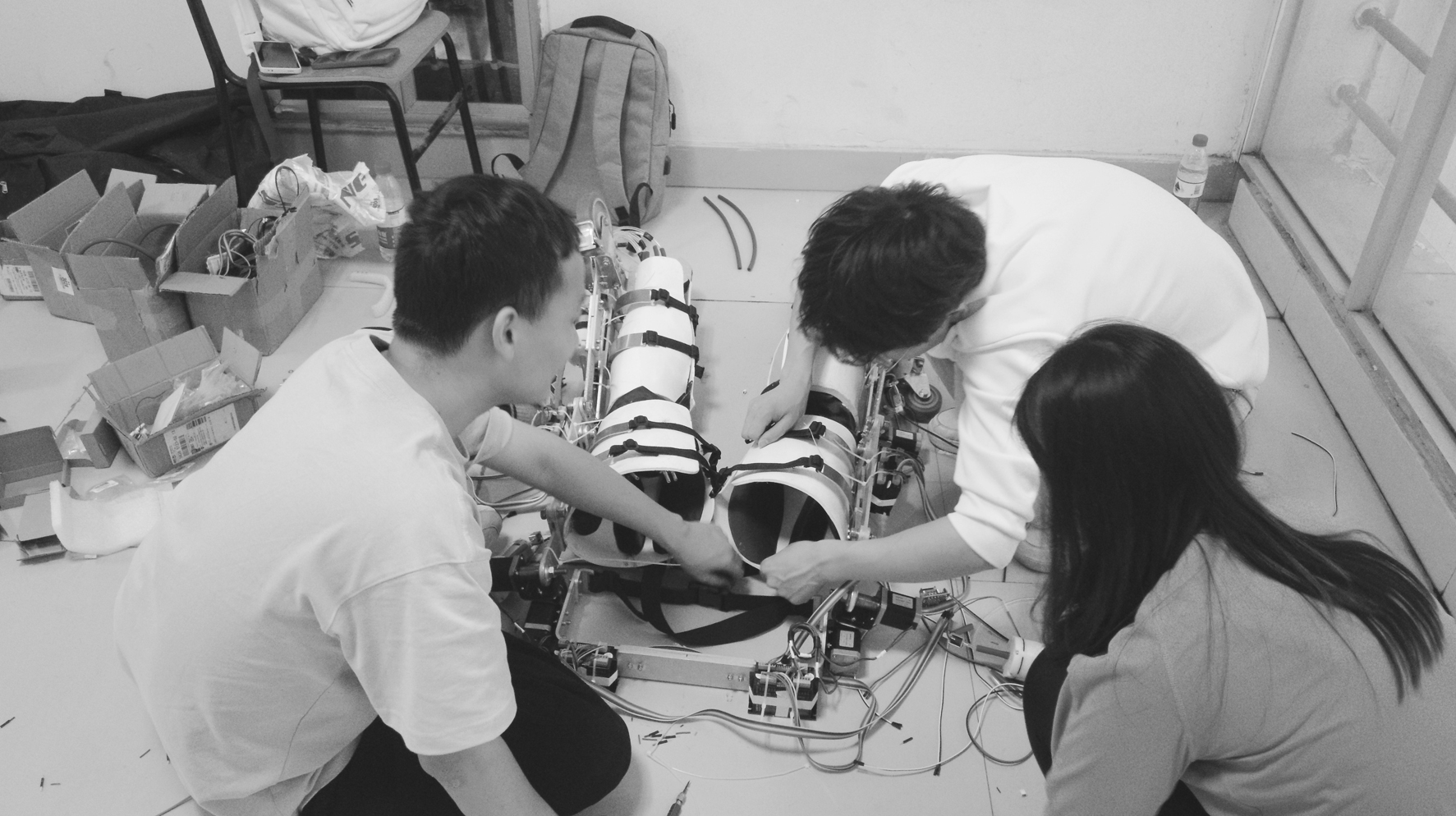 对于能够大胆放手去做的团队成员来讲,来自指导老师的支持和鼓励一定是最坚实的后盾,气动协调式外骨骼的团队也不例外。在这条漫漫研发路上,郝亮、毛志伟和曾新星三位老师的指导帮助就如明灯一般照亮前路。