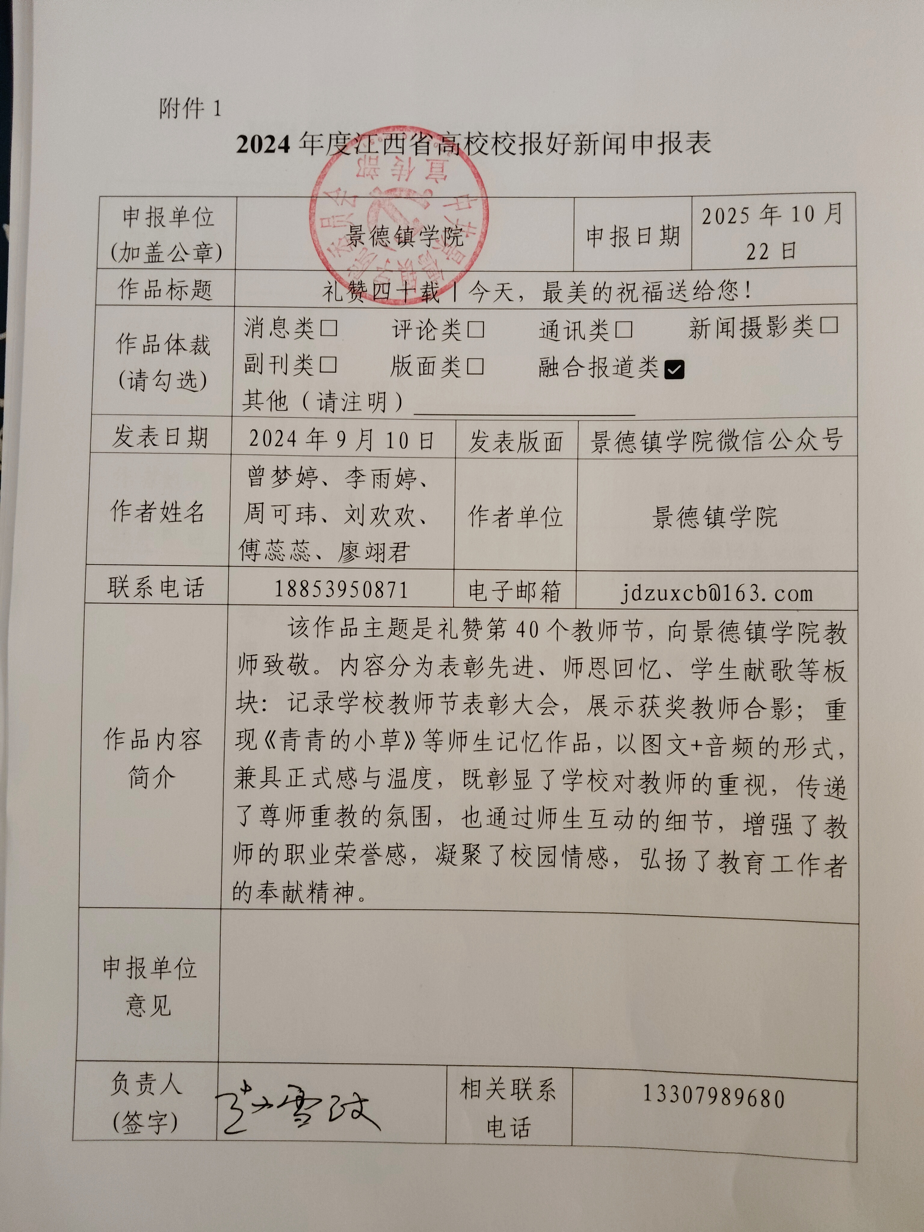 该作品主题是礼赞第40个教师节,向景德镇学院教师致敬。 该作品主题是礼赞第40个教师节,向景德镇学院教师致敬。内容分为表彰先进、师恩回忆、学生献歌等板块:记录学校教师节表彰大会,展示获奖教师合影;重现《青青的小草》等师生记忆作品,以图文+音频的形式,兼具正式感与温度,既彰显了学校对教师的重视,传递了尊师重教的氛围,也通过师生互动的细节,增强了教师的职业荣誉感,凝聚了校园情感,弘扬了教育工作者的奉献精神。