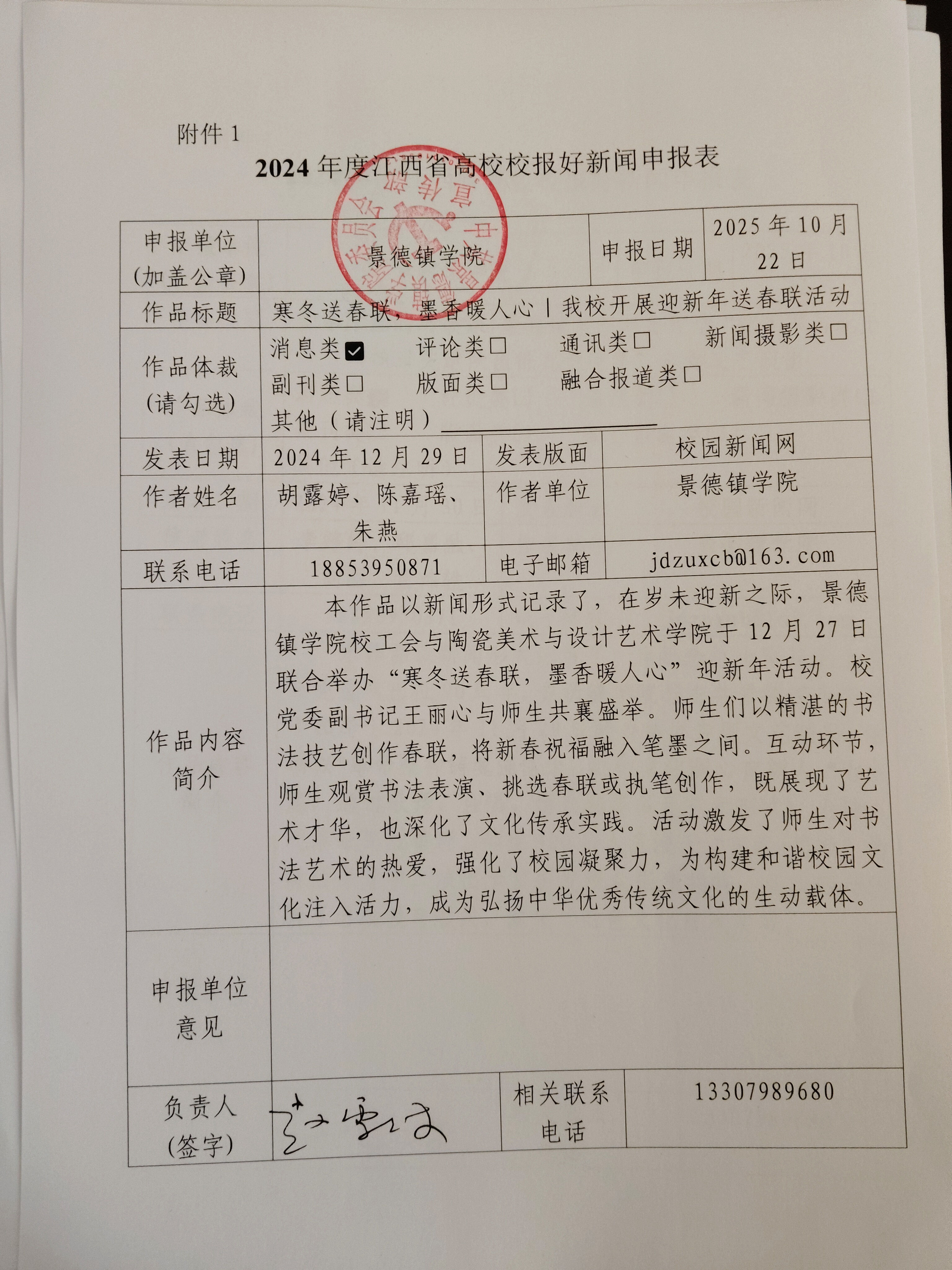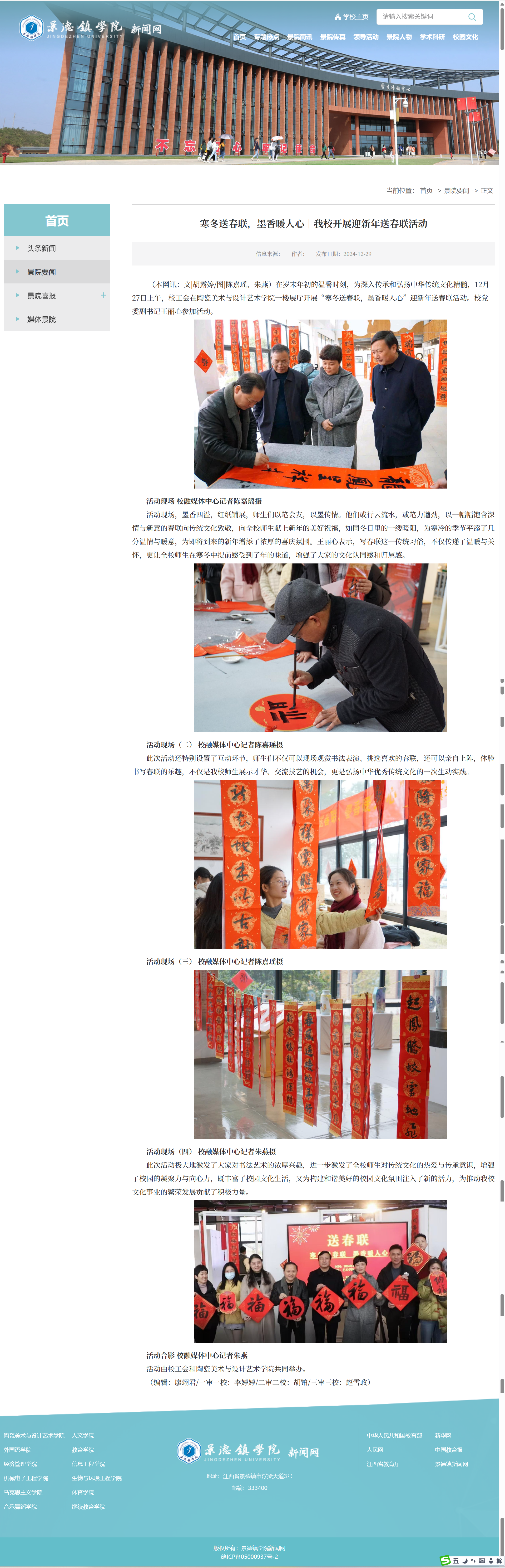 本作品以新闻形式记录了,在岁未迎新之际,景德镇学院校工会与陶瓷美术与设计艺术学院于12月27日联合举办“寒冬送春联,墨香暖人心”迎新年活动。 本作品以新闻形式记录了,在岁未迎新之际,景德镇学院校工会与陶瓷美术与设计艺术学院于12月27日联合举办“寒冬送春联,墨香暖人心”迎新年活动。校党委副书记王丽心与师生共襄盛举。师生们以精湛的书法技艺创作春联,将新春祝福融入笔墨之间。互动环节,师生观赏书法表演、挑选春联或执笔创作,既展现了艺术才华,也深化了文化传承实践。活动激发了师生对书法艺术的热爱,强化了校园凝聚力,为构建和谐校园文化注入活力,成为弘扬中华优秀传统文化的生动载体。