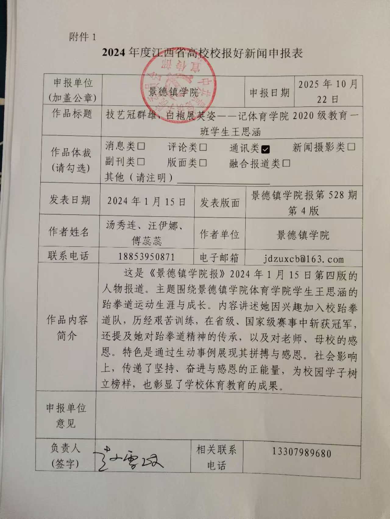 人物简介:王思涵,景德镇学院体育学院2020级体育教育一班学生,共青团员,担任体育学院的学生会主席团成员。在2021-2022年分别获得校级“优秀团员”荣誉称号,“篮球一级裁判员”资质,并多次取得“优秀裁判员”等荣誉称号。大一开始跟从自己的兴趣爱好加入景德镇学院跆拳道训练队,在张宜康老师的带领下,在2022年获得江西省第16届运动会跆拳道比赛高校本科乙组女子-67公斤级冠军。2023年,获得第17届中国大学生跆拳道锦标赛女子-67公斤冠军,并被授予“优秀运动员”称号。2023年,荣获2022-2023学年体育学院大学生年度人物称号。