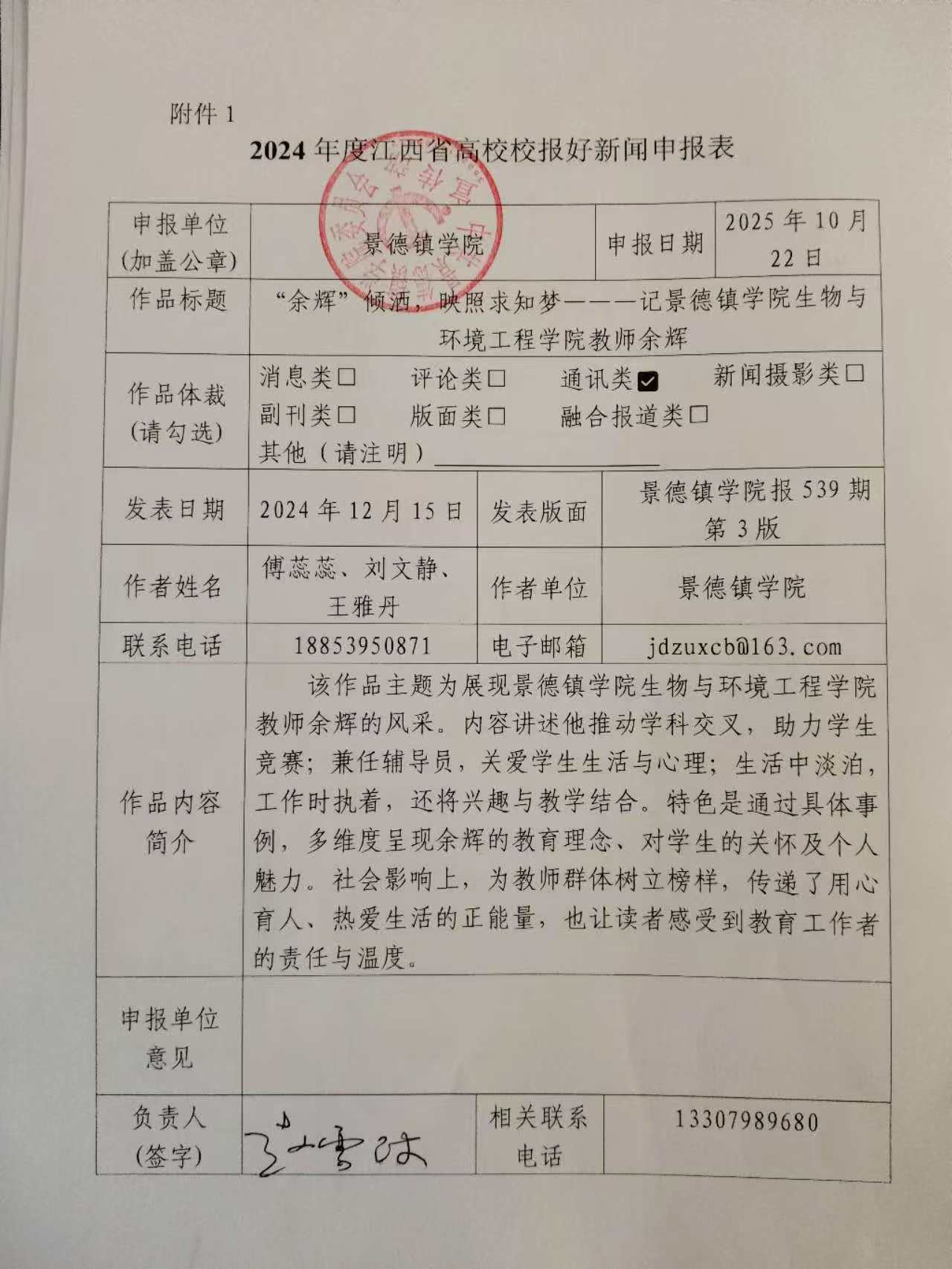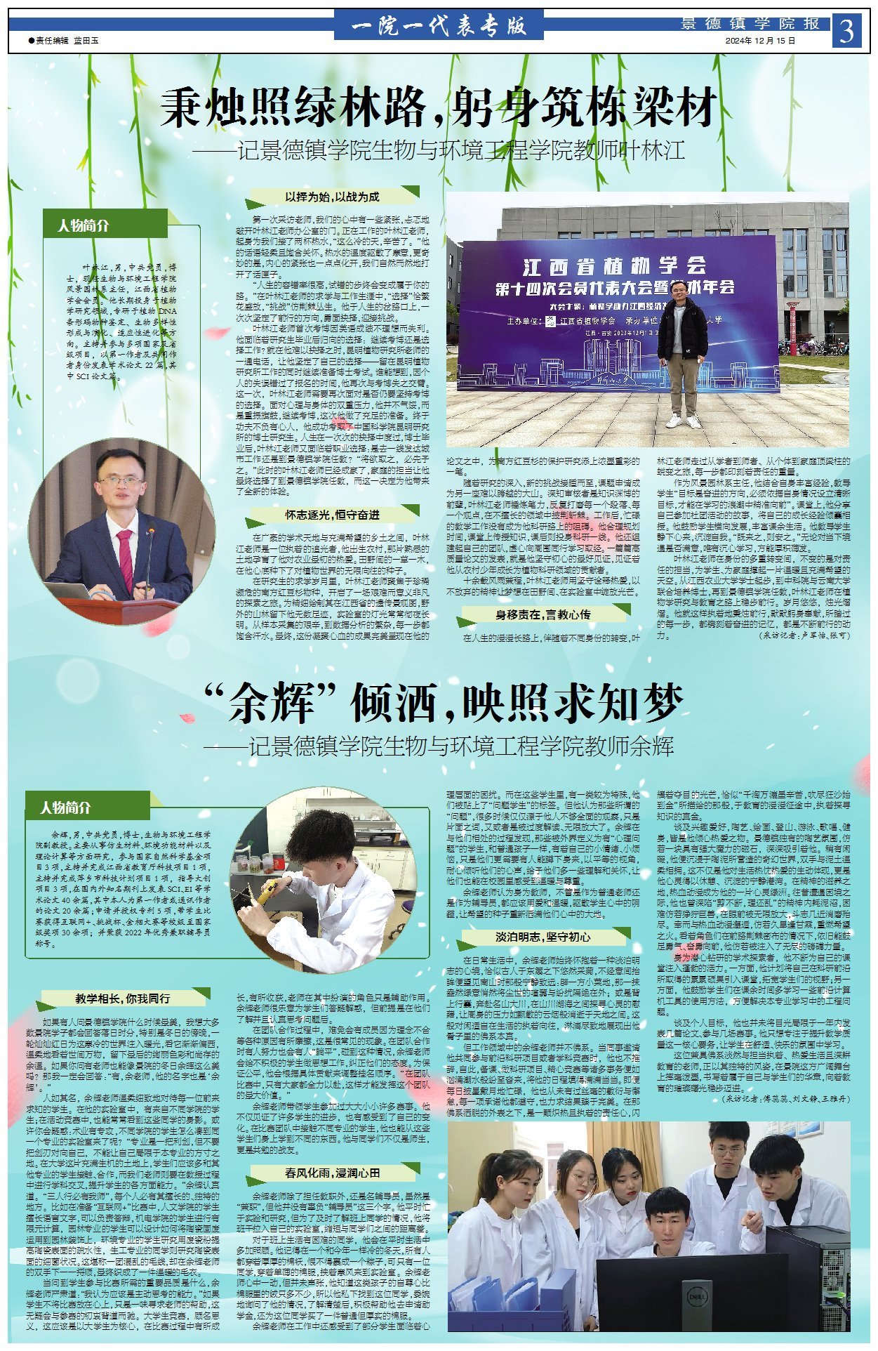“余辉”倾洒,映照求知梦———记景德镇学院生物与环境工程学院教师余辉