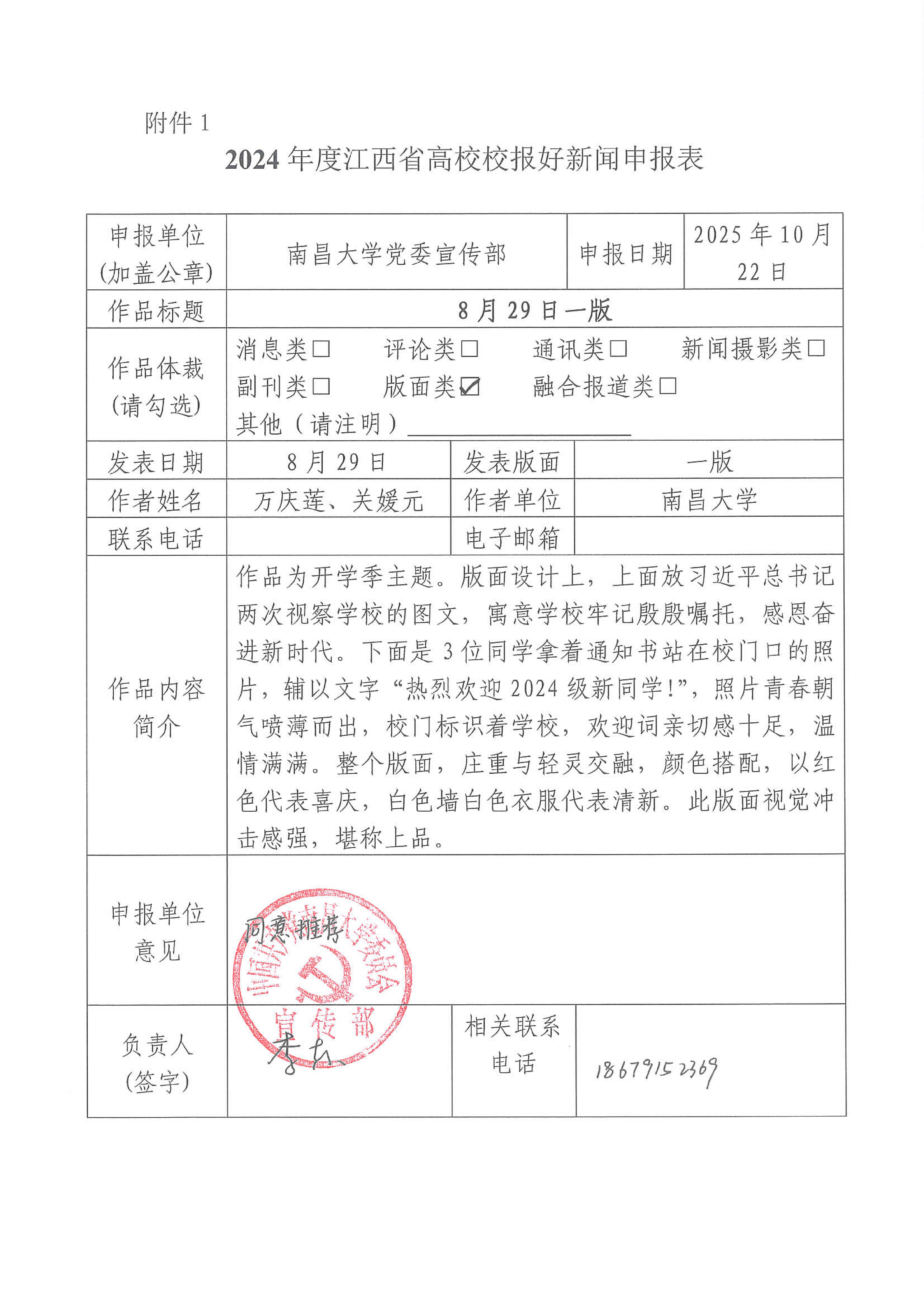 作品为开学季主题。版面设计上,上面放习近平总书记两次视察学校的图文,寓意学校牢记殷殷嘱托,感恩奋进新时代。下面是3位同学拿着通知书站在校门口的照片,辅以文字“热烈欢迎2024级新同学!”,照片青春朝气喷薄而出,校门标识着学校,欢迎词亲切感十足,温情满满。整个版面,庄重与轻灵交融,颜色搭配,以红色代表喜庆,白色墙白色衣服代表清新。此版面视觉冲击感强,堪称上品。 2008年10月15日,习近平同志视察南昌大学,亲切看望学校师生员工,高兴地眺望山水相连、环境幽雅的校园,称赞南昌大学的校园建设走在全国前列,很有远见,很有水平,在参观校园途中听取了学校关于学科建设、高层次人才队伍建设等情况汇报,对学校半导体发光材料的成果转化给予了充分肯定,鼓励学校加强高层次人才队伍建设,并深情寄语:“南昌大学,前景无限。”