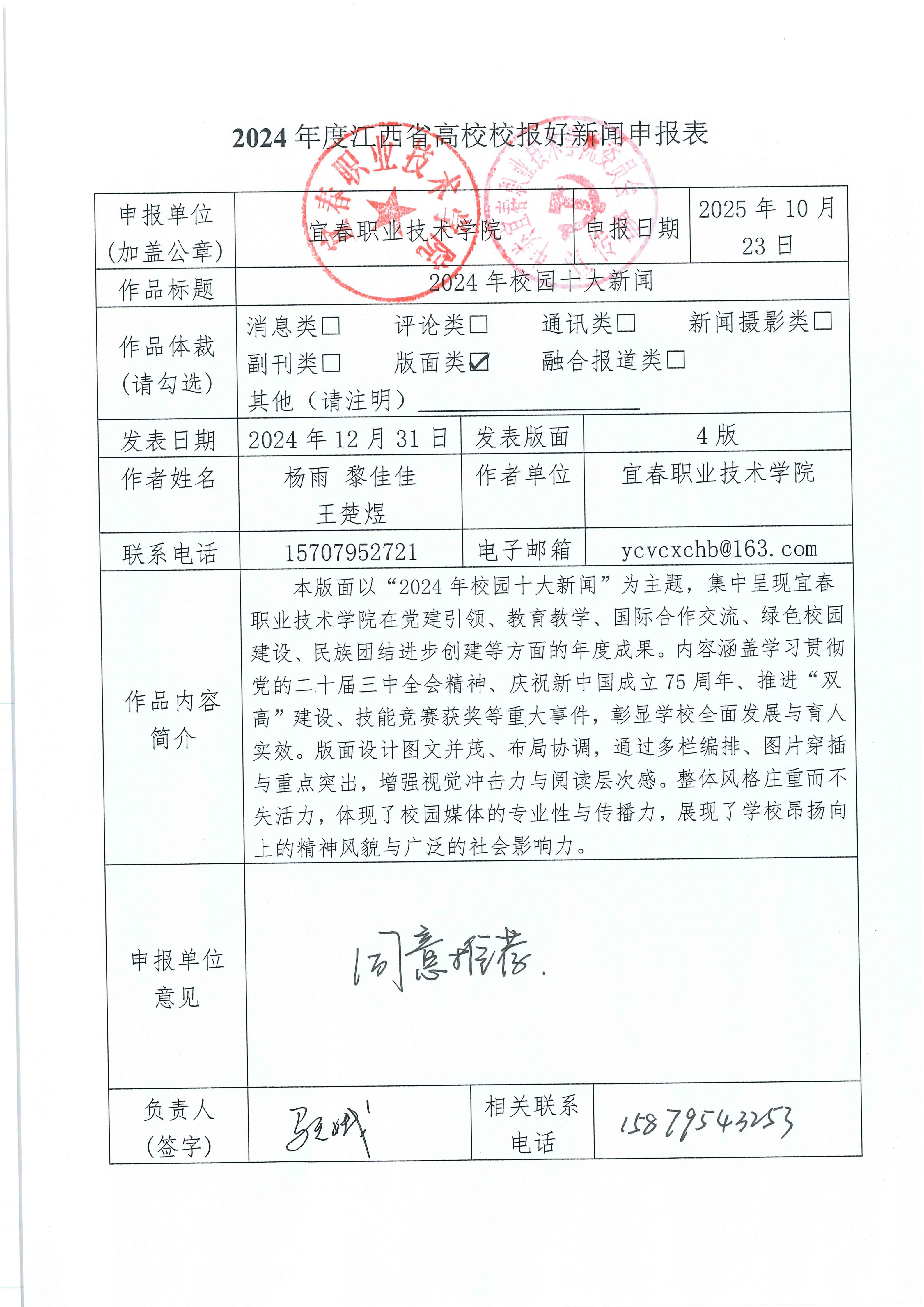 本版面以“2024年校园十大新闻”为主题,集中呈现宜春职业技术学院在党建引领、教育教学、国际合作交流、绿色校园建设、民族团结进步创建等方面的年度成果。内容涵盖学习贯彻党的二十届三中全会精神、庆祝新中国成立75周年、推进“双高”建设、技能竞赛获奖等重大事件,彰显学校全面发展与育人实效。版面设计图文并茂、布局协调,通过多栏编排、图片穿插与重点突出,增强视觉冲击力与阅读层次感。整体风格庄重而不失活力,体现了校园媒体的专业性与传播力,展现了学校昂扬向上的精神风貌与广泛的社会影响力。
