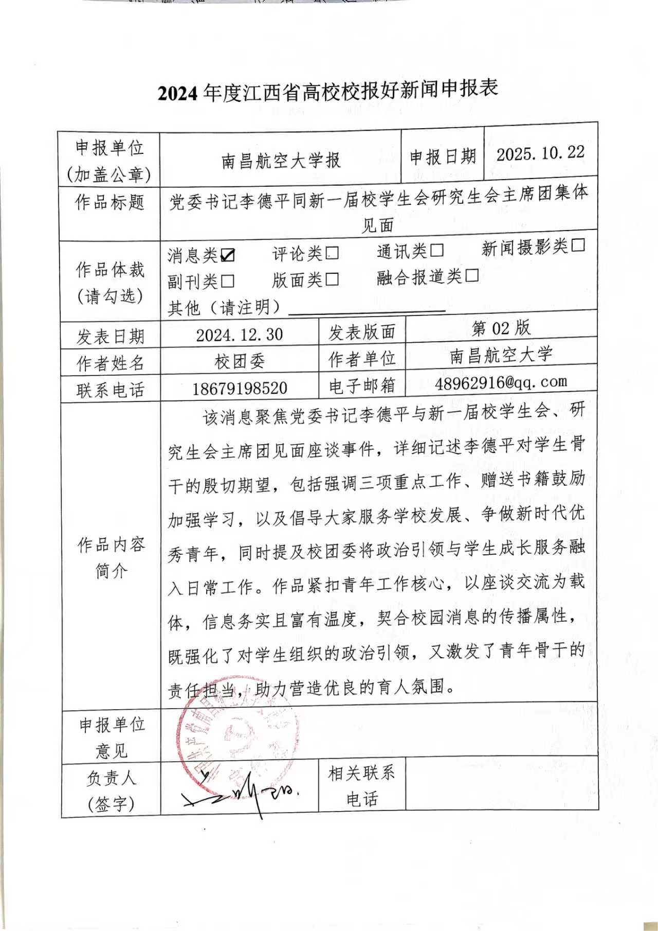该消息聚焦党委书记李德平与新一届校学生会、研究生会主席团见面座谈事件,详细记述李德平对学生骨干的殷切期望,包括强调三项重点工作、赠送书籍鼓励加强学习,以及倡导大家服务学校发展、争做新时代优秀青年,同时提及校团委将政治引领与学生成长服务融入日常工作。作品紧扣青年工作核心,以座谈交流为载体,信息务实且富有温度,契合校园消息的传播属性,既强化了对学生组织的政治引领,又激发了青年骨干的责任担当,助力营造优良的育人氛围。