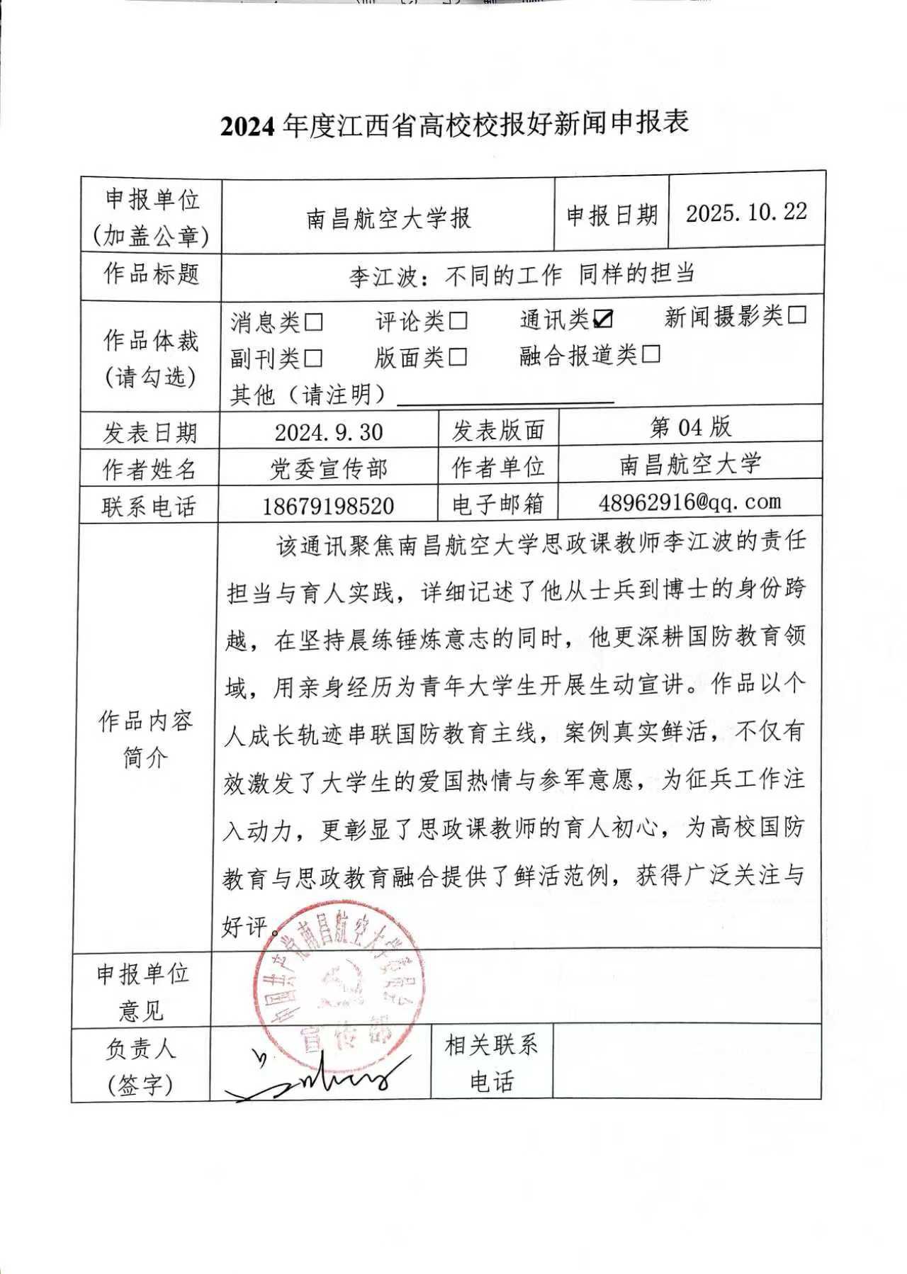 功夫不负有心人。三年后,李江波于 2017 年毕业,2019 年入职南昌航空大学,从讲台下的学生,走上讲台成为一名思政课教师。多重身份的转变,带来的是知识的累积和经历的沉淀。于是,他开始尝试将思政与国防融合起来,仿佛通过授课中又继续了自己的军旅生涯。