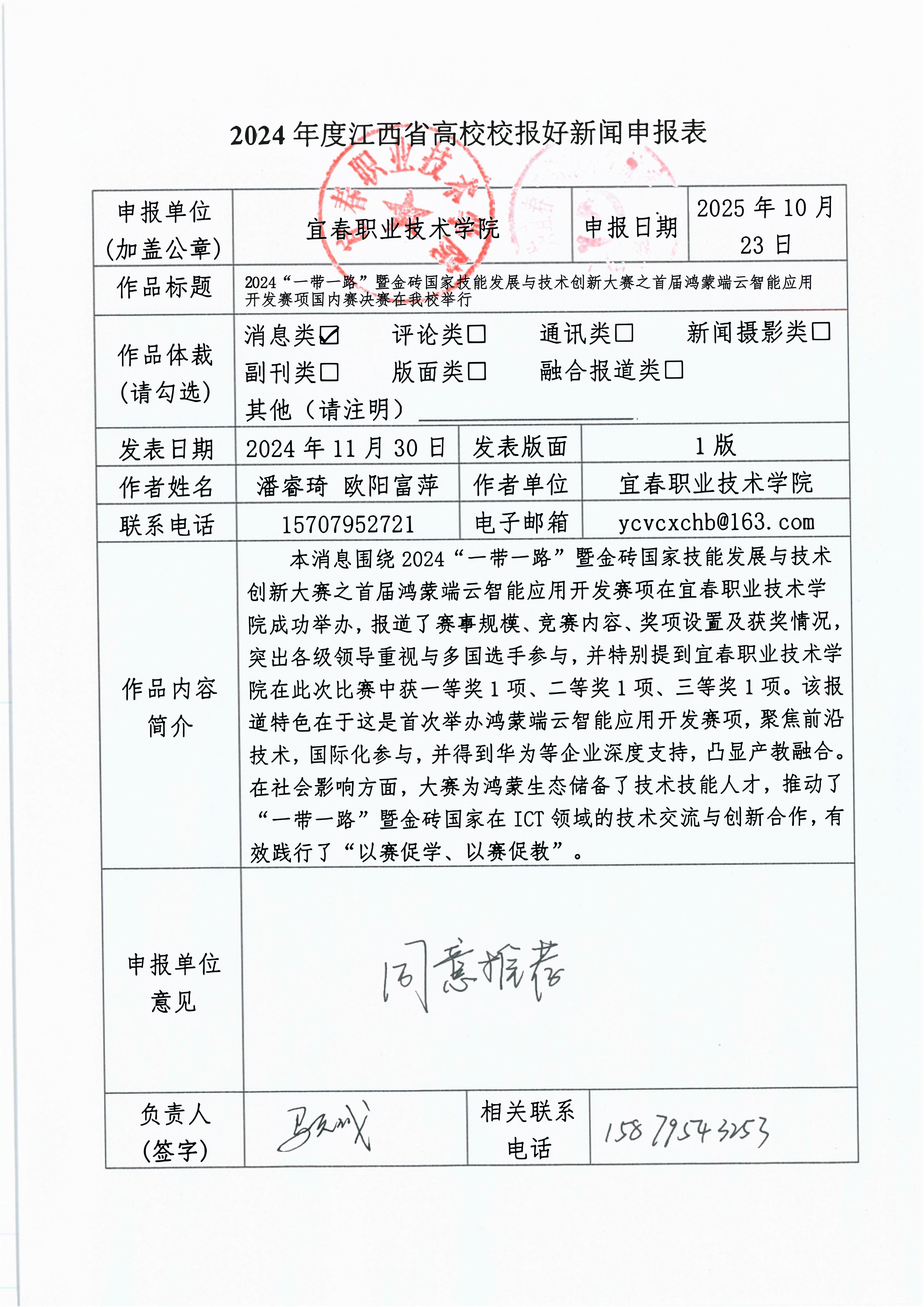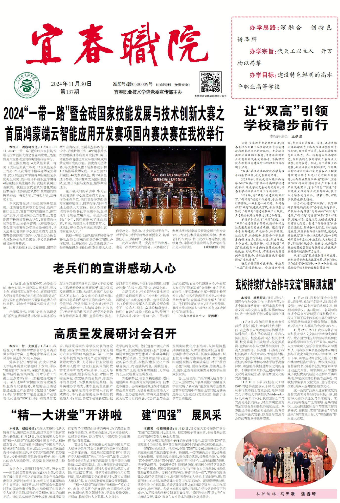 本报讯 潘睿琦报道:11月8日-10日,2024“一带一路”暨金砖国家技能发展与技术创新大赛之首届鸿蒙端云智能应用开发赛项国内赛决赛在我校举行。