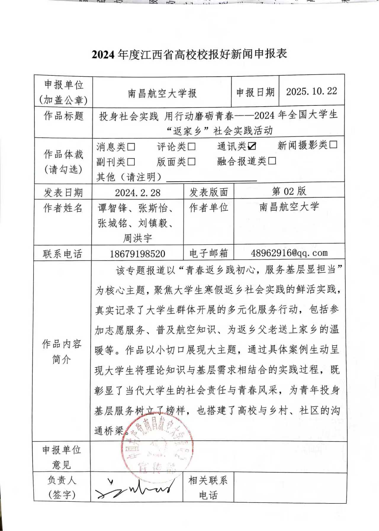 在实践的过程中,一开始,面对孩子们的十万个为什么,时不时的嬉戏争吵,我也会感受到头大。但是,当孩子们了解中国航空航天发展历程后露出惊讶和自豪的表情时,当孩子们认真倾听陆孝彭老校长和顾诵芬院士的英雄事迹时,当孩子们说:“我以后也想成为像杨利伟一样的英雄,探索属于我们中国自己的空间站”时,我真的感受到了作为南昌航空大学飞行器工程学院学生的自豪,同时我也更加深刻理解了参加“返家乡”社会实践活动的意义和价值,一次小小的实践,说不定就能在这些孩子的心里,洒下航空报国的种子,某一天便能生根发芽,长成为参天大树,这也更坚定了我投身航空事业的决心!在以后的学习生活中,我将更加努力学习专业知识,投身国家航空事业发展,让每一个国产飞行器都有一个强劲智能的“中国心”。