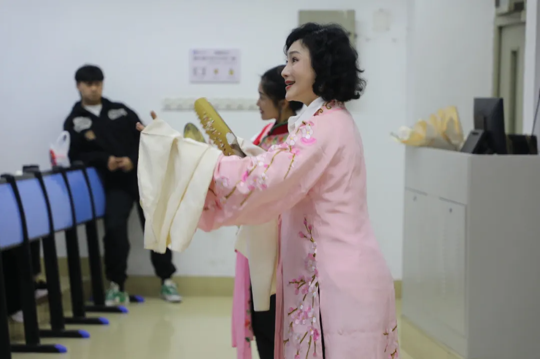 课堂上,陈俐老师换上戏服,伴随着音乐,和孔丽琴老师一同给学生们表演了一段经典剧目《牡丹亭·游园》。除此之外,她还展示了戏曲中折扇、水袖和枪的运用,或典雅、或柔美、或飒爽,都引发了学生们的阵阵惊呼。