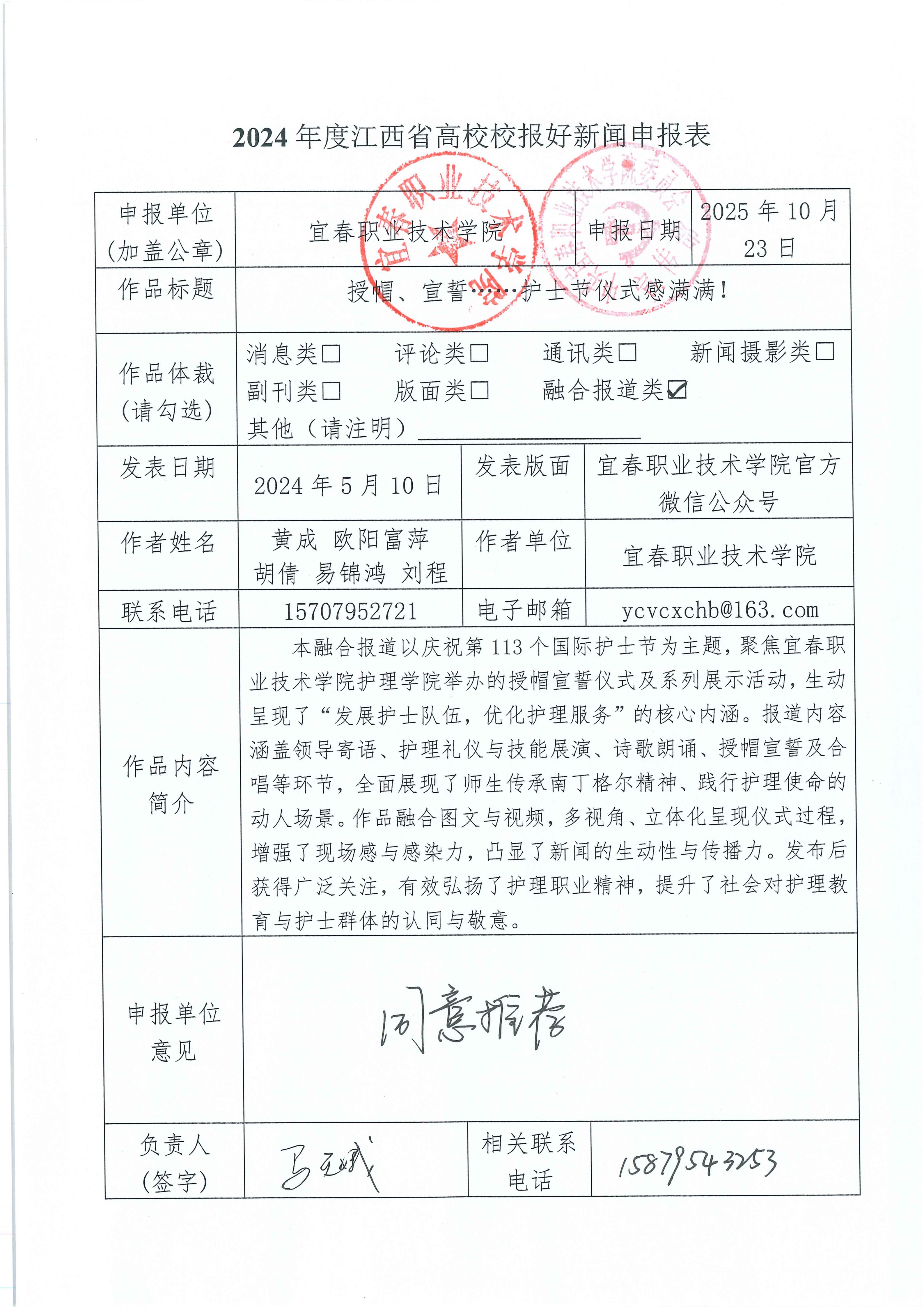 本融合报道以庆祝第113个国际护士节为主题,聚焦宜春职业技术学院护理学院举办的授帽宣誓仪式及系列展示活动,生动呈现了“发展护士队伍,优化护理服务”的核心内涵。报道内容涵盖领导寄语、护理礼仪与技能展演、诗歌朗诵、授帽宣誓及合唱等环节,全面展现了师生传承南丁格尔精神、践行护理使命的动人场景。作品融合图文与视频,多视角、立体化呈现仪式过程,增强了现场感与感染力,凸显了新闻的生动性与传播力。发布后获得广泛关注,有效弘扬了护理职业精神,提升了社会对护理教育与护士群体的认同与敬意。