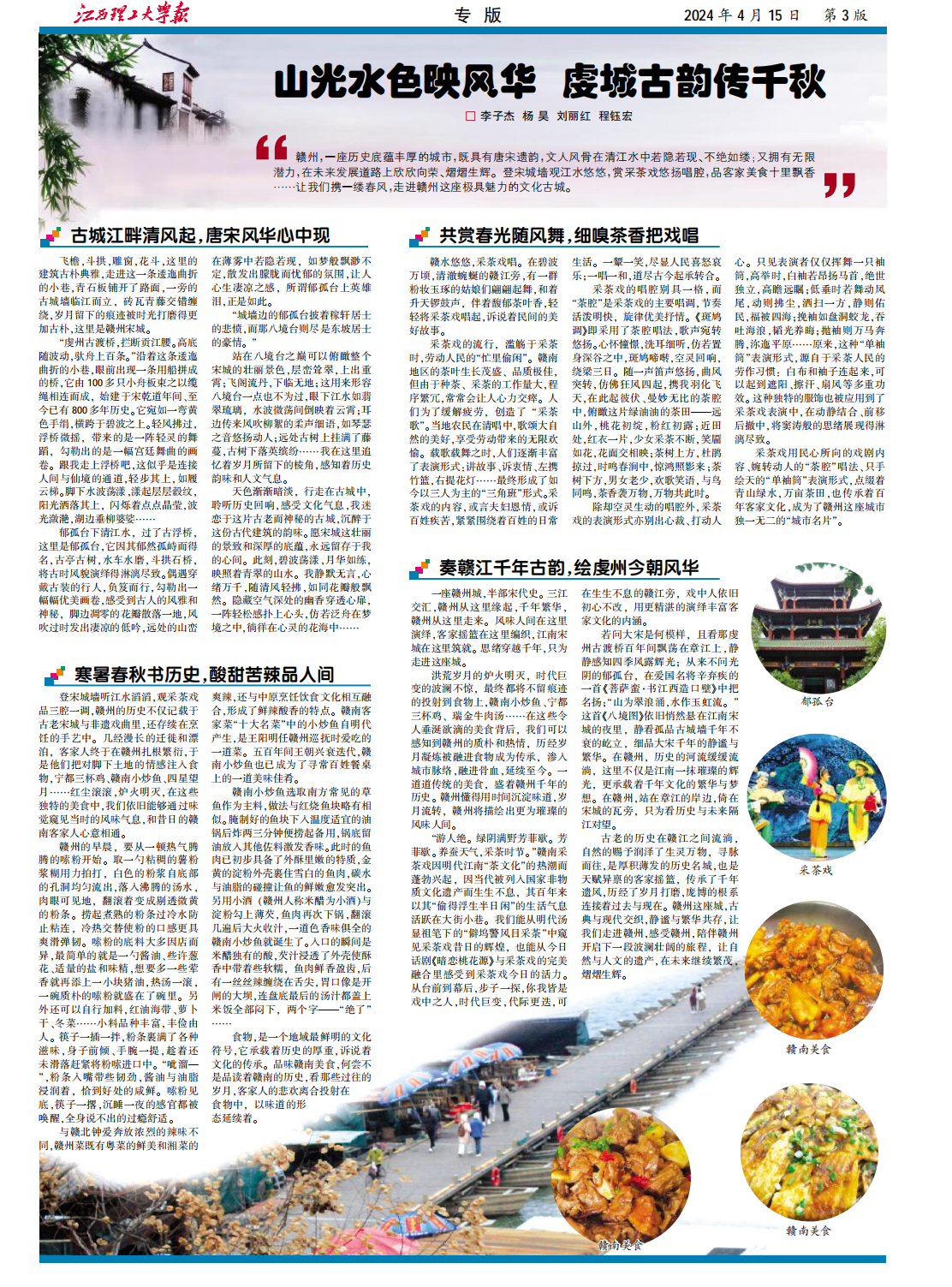 “赣州,一座历史底蕴丰厚的城市,既具有唐宋遗韵,文人风骨在清江水中若隐若现、不绝如缕;又拥有无限潜力,在未来发展道路上欣欣向荣、熠熠生辉。登宋城墙观江水悠悠,赏采茶戏悠扬唱腔,品客家美食十里飘香……让我们携一缕春风,走进赣州这座极具魅力的文化古城。”