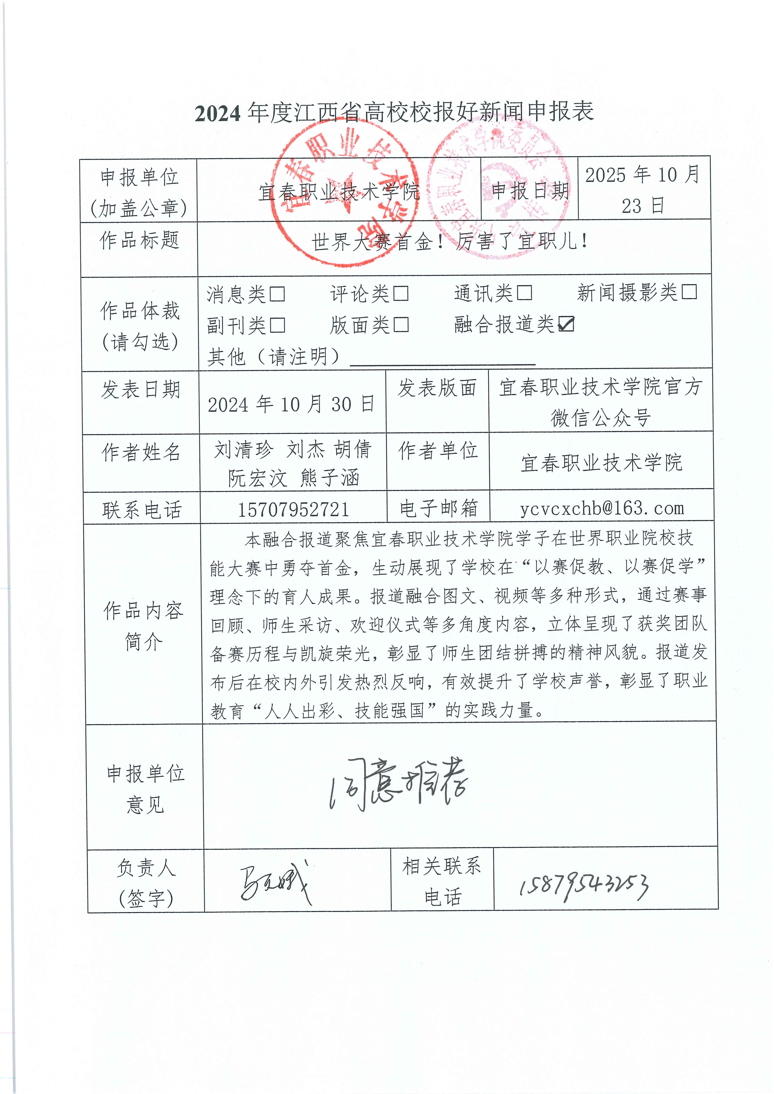 本融合报道聚焦宜春职业技术学院学子在世界职业院校技能大赛中勇夺首金,生动展现了学校在“以赛促教、以赛促学”理念下的育人成果。报道融合图文、视频等多种形式,通过赛事回顾、师生采访、欢迎仪式等多角度内容,立体呈现了获奖团队备赛历程与凯旋荣光,彰显了师生团结拼搏的精神风貌。报道发布后在校内外引发热烈反响,有效提升了学校声誉,彰显了职业教育“人人出彩、技能强国”的实践力量。