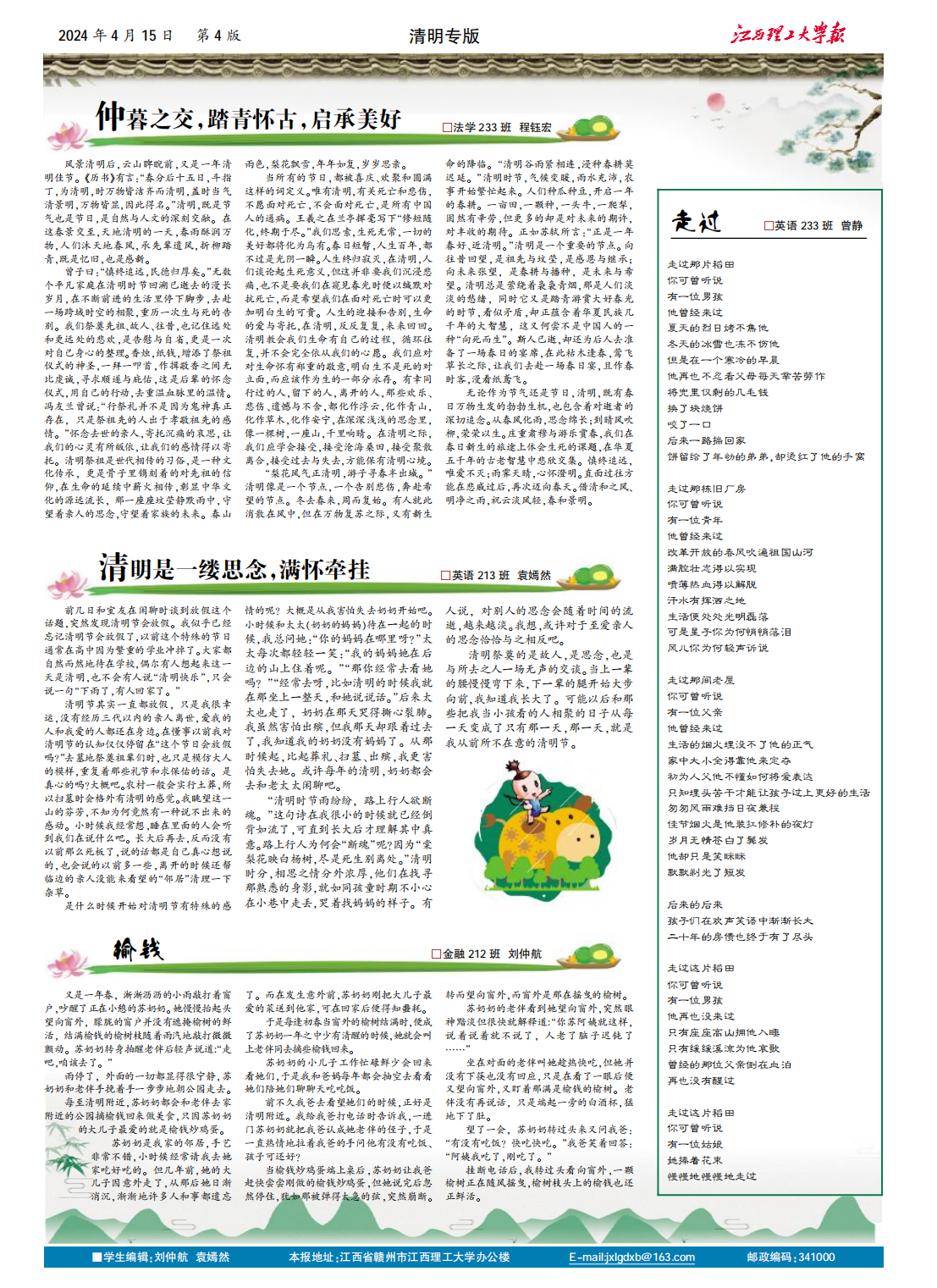 风景清明后,云山睥睨前,又是一年清明佳节。《历书》有言:“春分后十五日,斗指丁,为清明,时万物皆洁齐而清明,盖时当气清景明,万物皆显,因此得名。”清明,既是节气也是节日,是自然与人文的深刻交融。在这春景至日,天地清明的一天,春雨酥润万物,人们沐天地春风,承先辈遗风,折柳踏青,既是忆旧,也是感新。