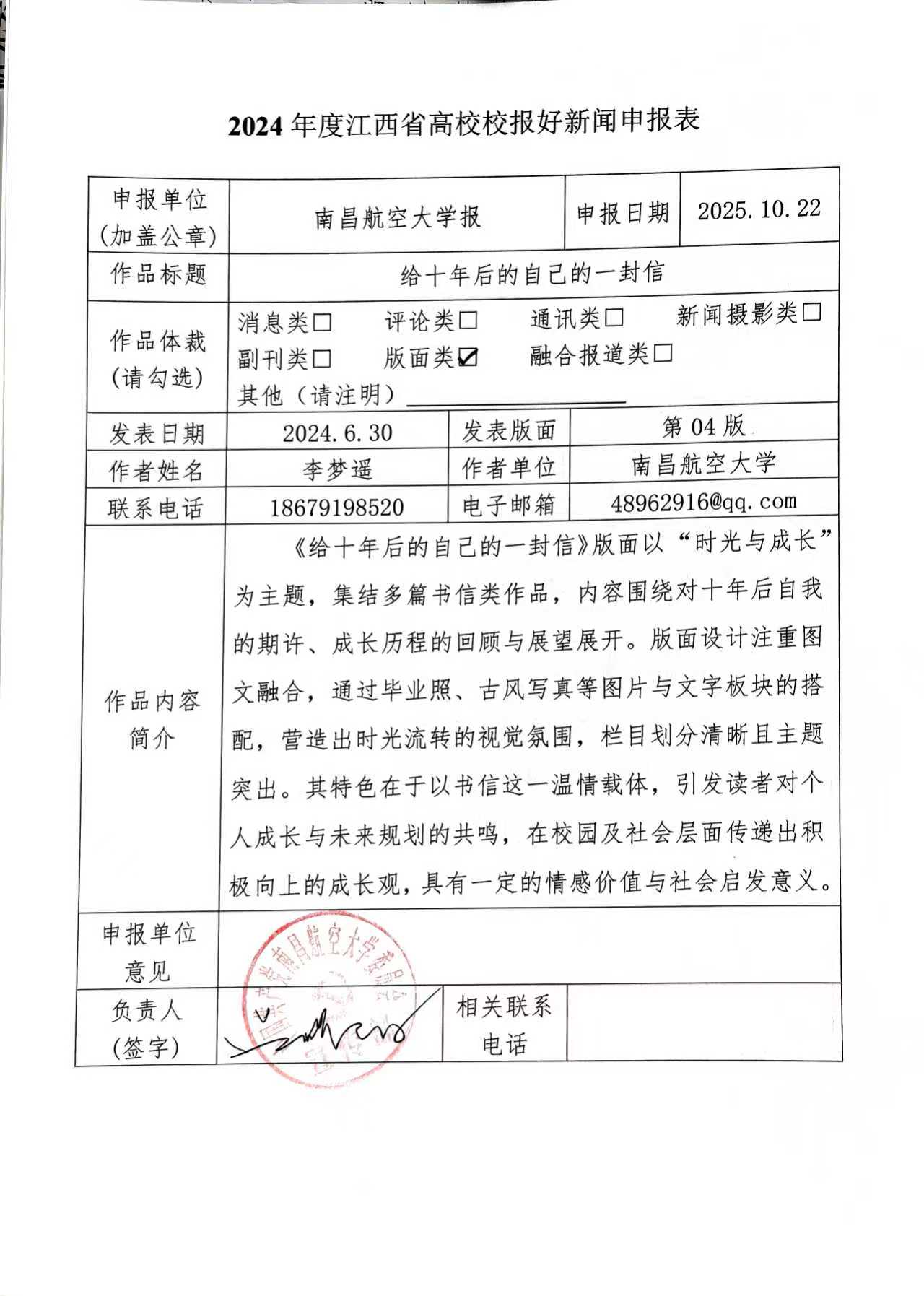 《给十年后的自己的一封信》版面以 “时光与成长” 为主题,集结多篇书信类作品,内容围绕对十年后自我的期许、成长历程的回顾与展望展开。版面设计注重图文融合,通过毕业照、古风写真等图片与文字板块的搭配,营造出时光流转的视觉氛围,栏目划分清晰且主题突出。其特色在于以书信这一温情载体,引发读者对个人成长与未来规划的共鸣,在校园及社会层面传递出积极向上的成长观,具有一定的情感价值与社会启发意义。