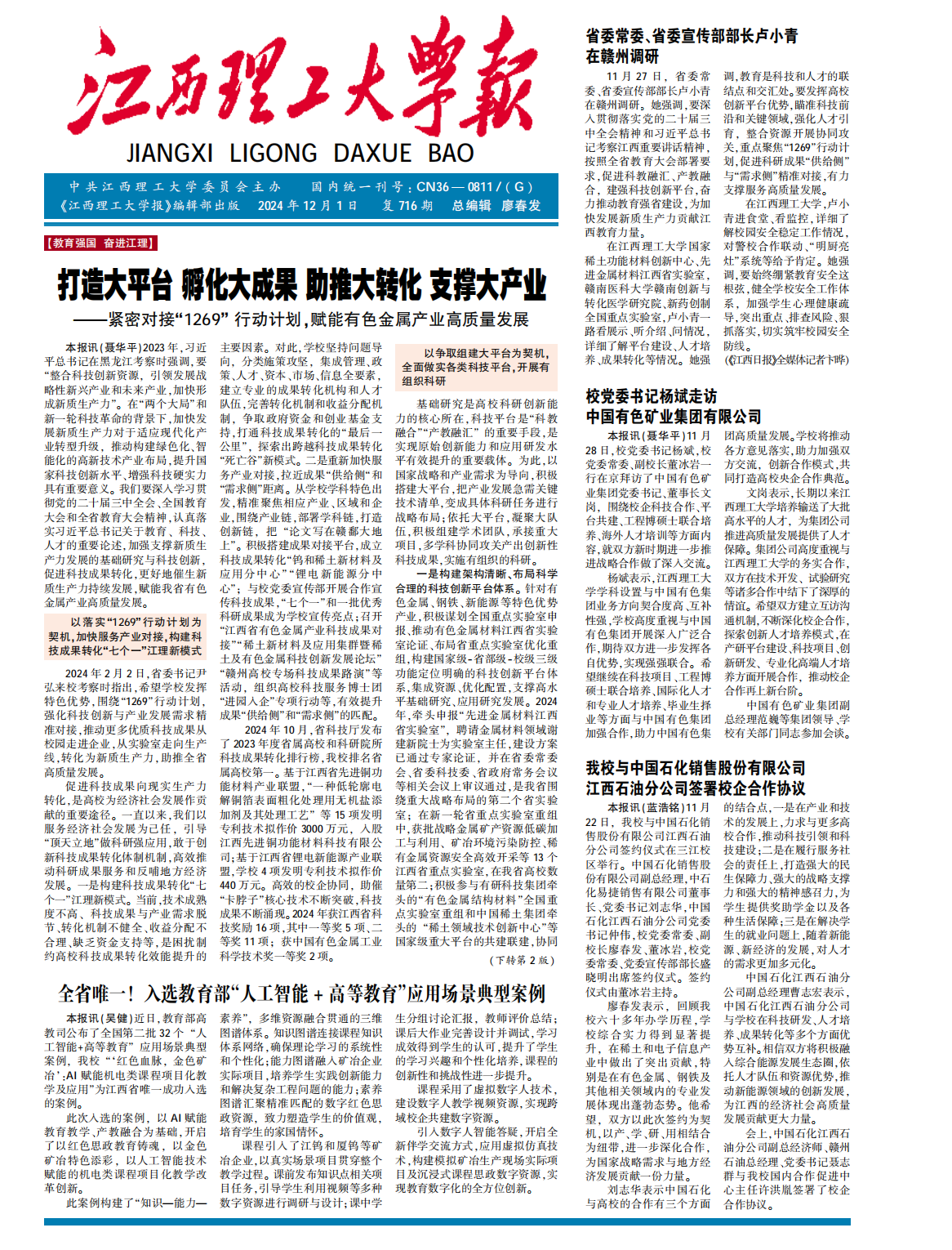 本报讯(吴健)近日,教育部高 教司公布了全国第二批32个“人工智能 + 高等教育”应用场景典型案例,我校“红色血脉,金色矿冶:AI赋能机电类课程项目化教学及应用”为江西省唯一成功入选的案例。