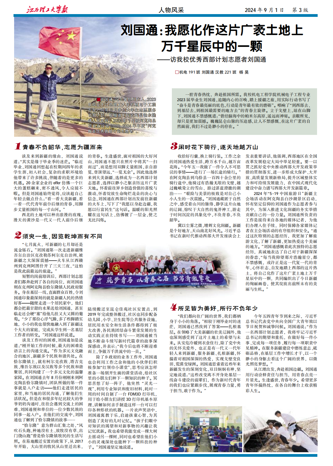 从江理出发,奔赴祖国边疆。刘国通用行动诠释责任与担当,用青春点亮一片星光。生逢盛世,青春年少。希望更多青年怀揣热忱,在各自的舞台上收获精彩人生。