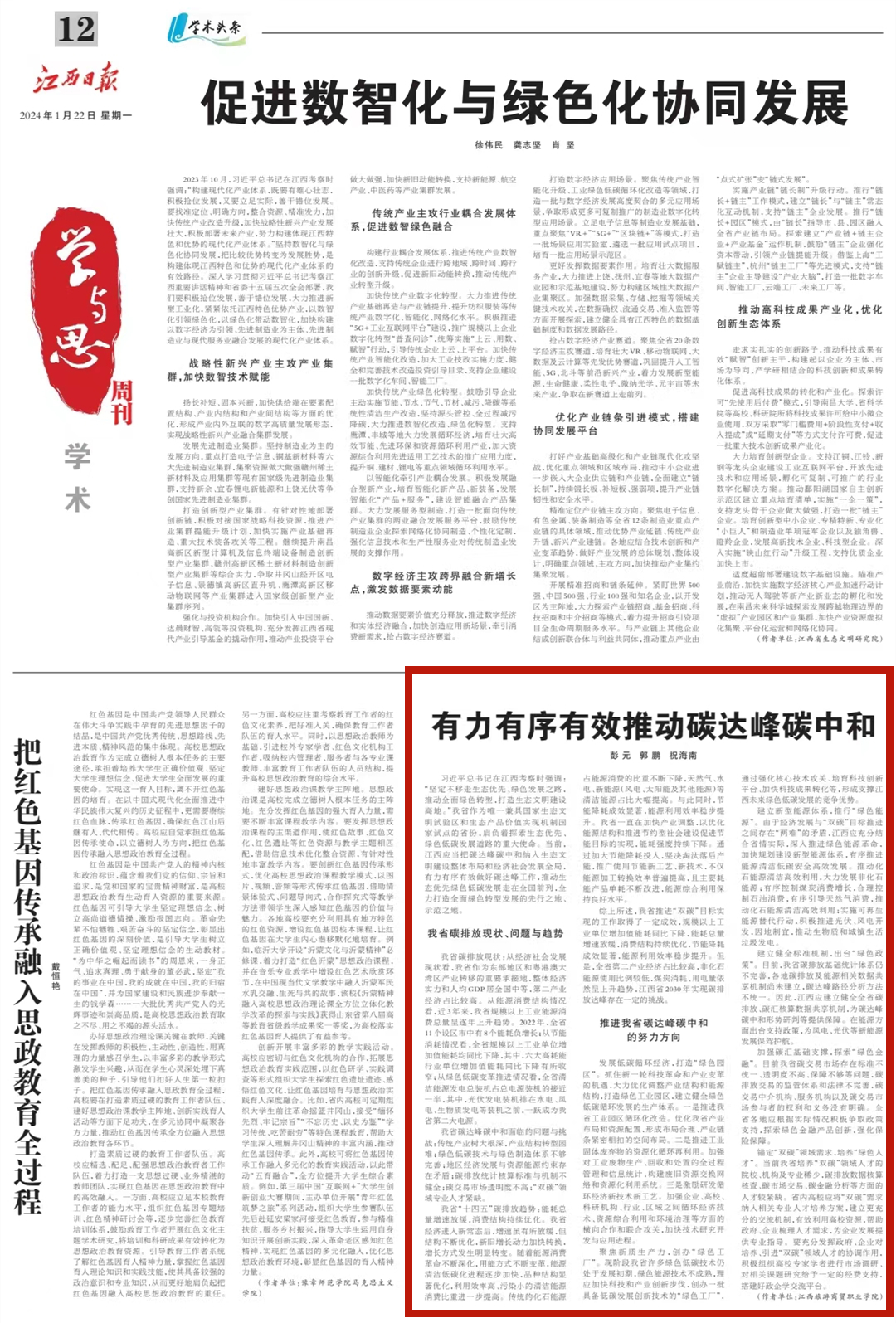 习近平总书记在江西考察时强调:“坚定不移走生态优先、绿色发展之路,推动全面绿色转型,打造生态文明建设高地。”我省作为唯一兼具国家生态文明试验区和生态产品价值实现机制国家试点的省份,肩负着探索生态优先、绿色低碳发展道路的重大使命。当前,江西应当把碳达峰碳中和纳入生态文明建设整体布局和经济社会发展全局,有力有序有效做好碳达峰工作,推动生态优先绿色低碳发展走在全国前列,全力打造全面绿色转型发展的先行之地、示范之地。