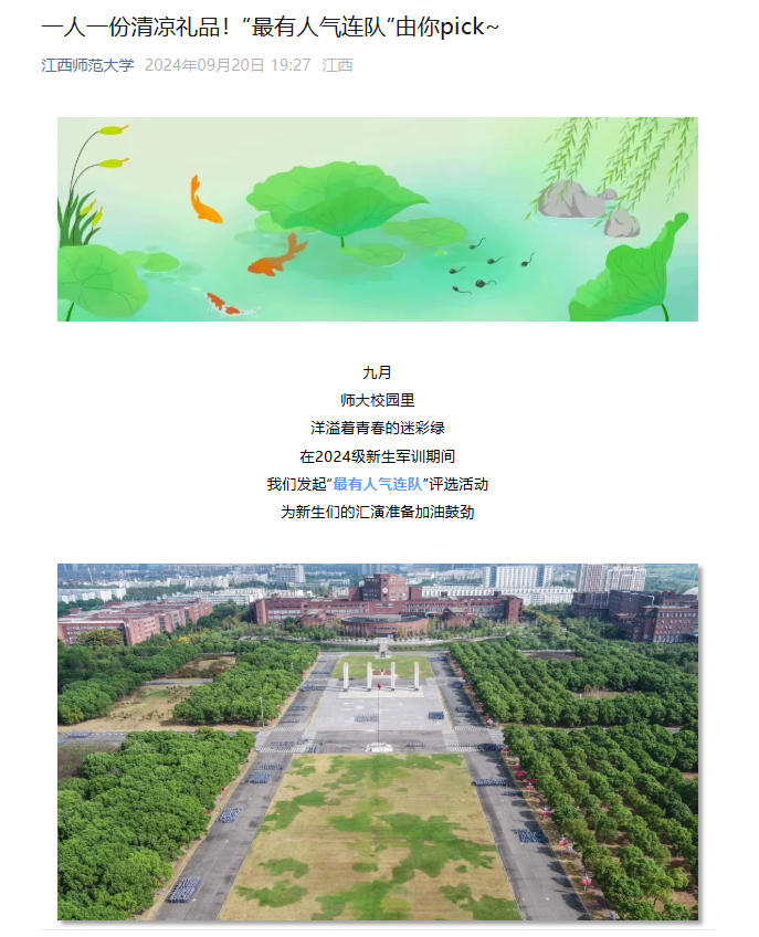 该作品通过图文结合的形式,生动呈现了25个参评连队的军训瞬间。旨在展现新生军训风采,增强集体荣誉感,展现了学子们昂扬的斗志与青春活力。特色在于以互动投票激发参与热情,并通过官方平台传播正能量,强化校园凝聚力。活动不仅记录了新生成长的珍贵画面,也传递了团结拼搏的军训精神,受到师生广泛关注。