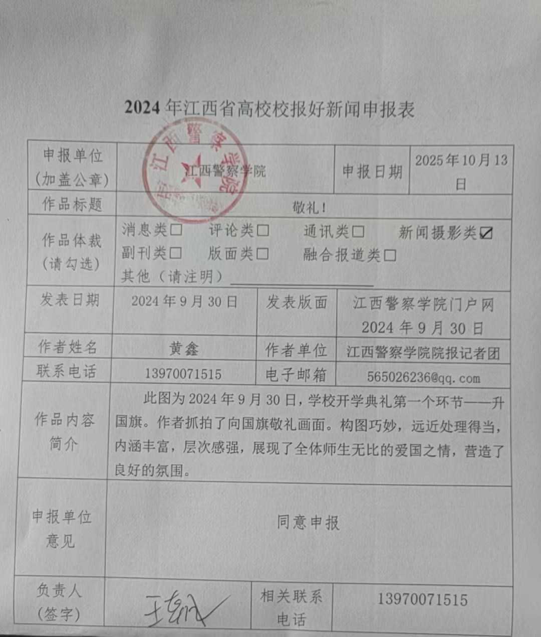 此图为2024年9月30日,学校开学典礼第一个环节——升国旗。作者抓拍了向国旗敬礼画面。构图巧妙,远近处理得当,内涵丰富,层次感强,展现了全体师生无比的爱国之情,营造了良好的氛围。