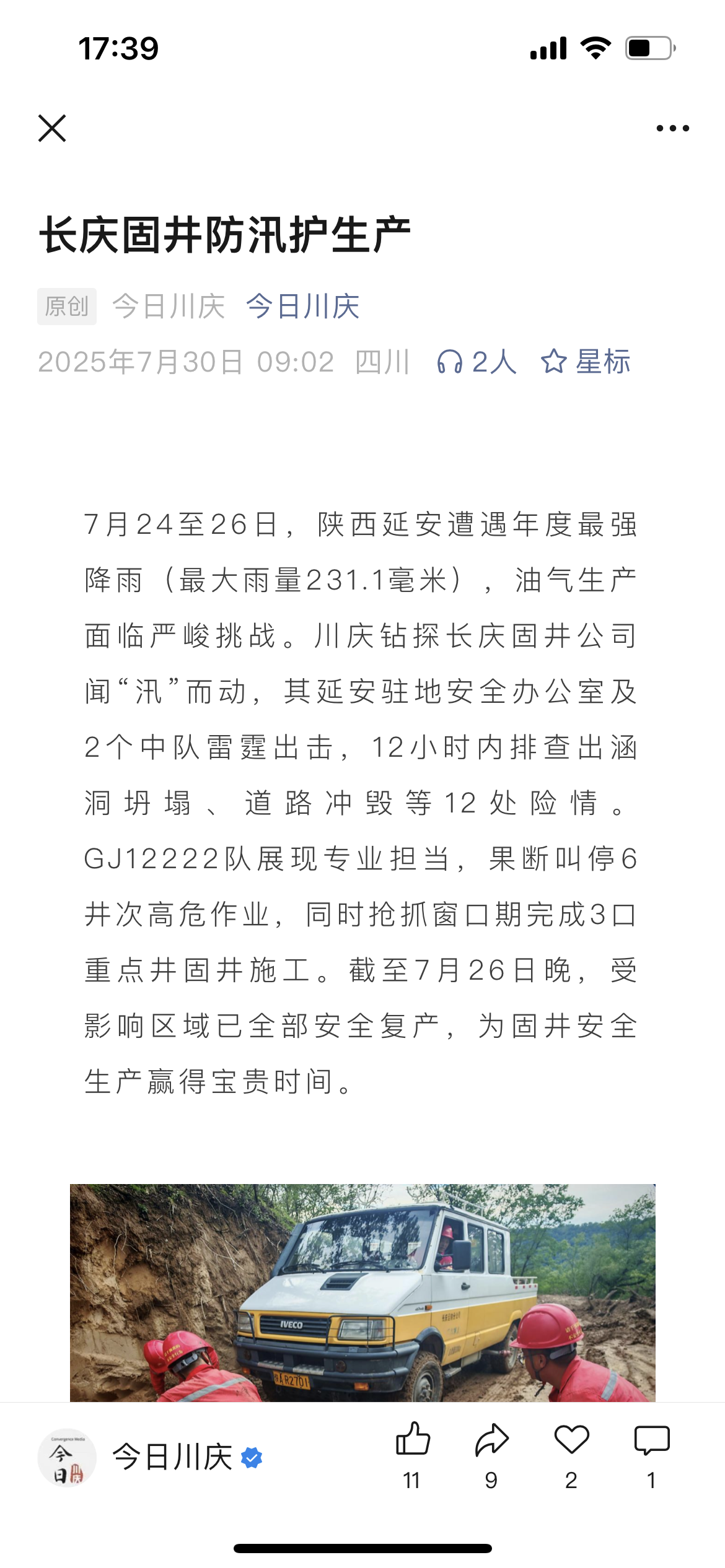 7月24至26日,陕西延安遭遇年度最强降雨(最大雨量231.1毫米),油气生产面临严峻挑战。川庆钻探长庆固井公司闻“汛”而动,其延安驻地安全办公室及2个中队雷霆出击,12小时内排查出涵洞坍塌、道路冲毁等12处险情。GJ12222队展现专业担当,果断叫停6井次高危作业,同时抢抓窗口期完成3口重点井固井施工。截至7月26日晚,受影响区域已全部安全复产,为固井安全生产赢得宝贵时间。