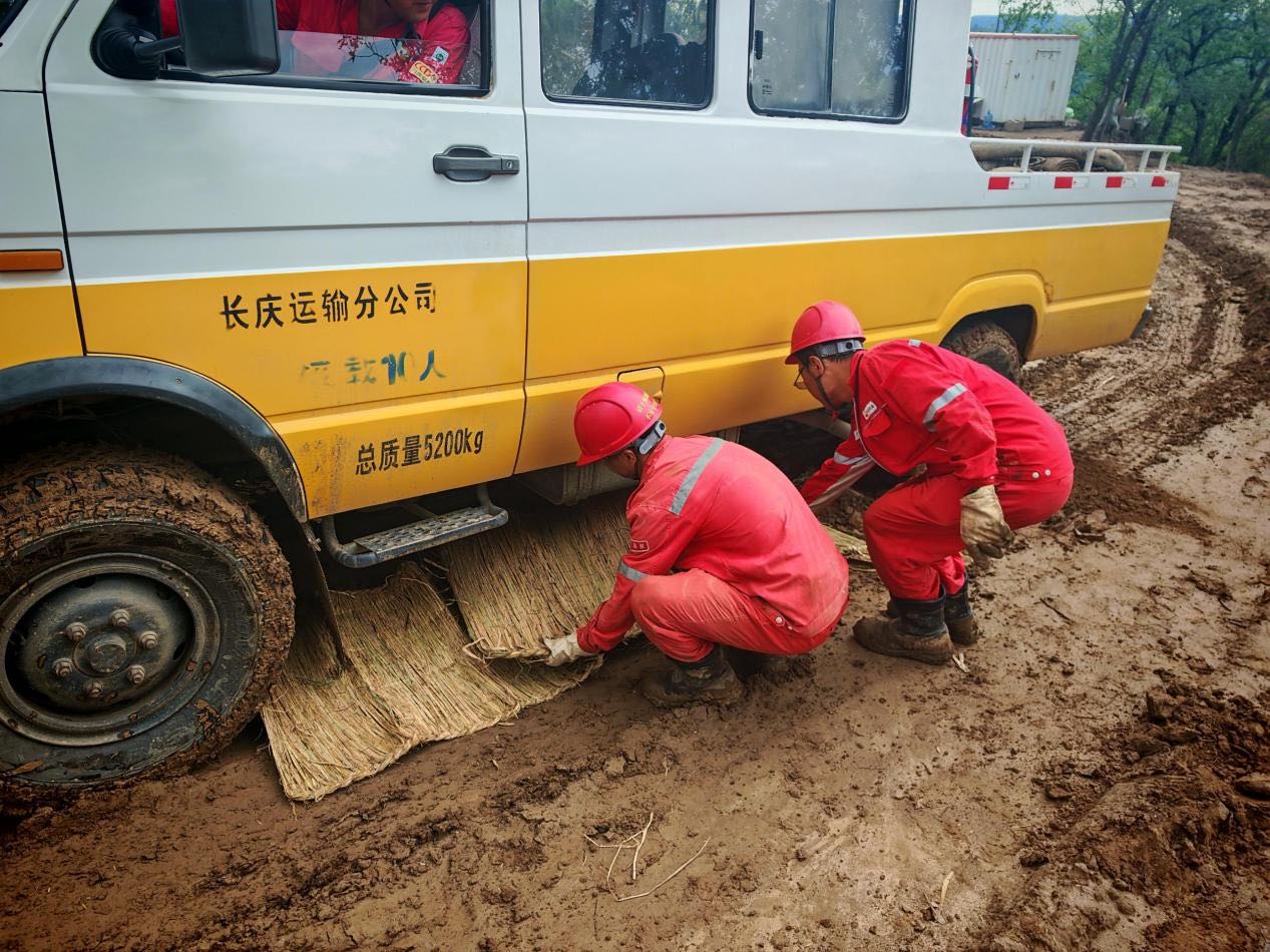 在陕北靖边,靖35*井场遭遇持续暴雨侵袭,导致通往作业现场的乡村道路出现多处深度积水,路面泥泞度达警戒级别,GJ23217队立即启动极端天气响应预案提前完成设备与人员调度,班组长做好道路勘察,标注风险点进行路况共享,绕行高风险路段,采取“前车探路、后车跟进”的编队模式,确保不落一车、不丢一人。