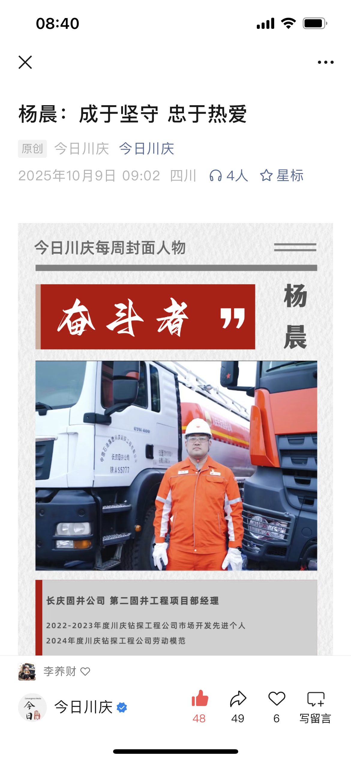“我的目标并非个人完成多少口井的固井作业,而是要让整个团队都能打造出高质量的固井工程。”杨晨坚定地说道。