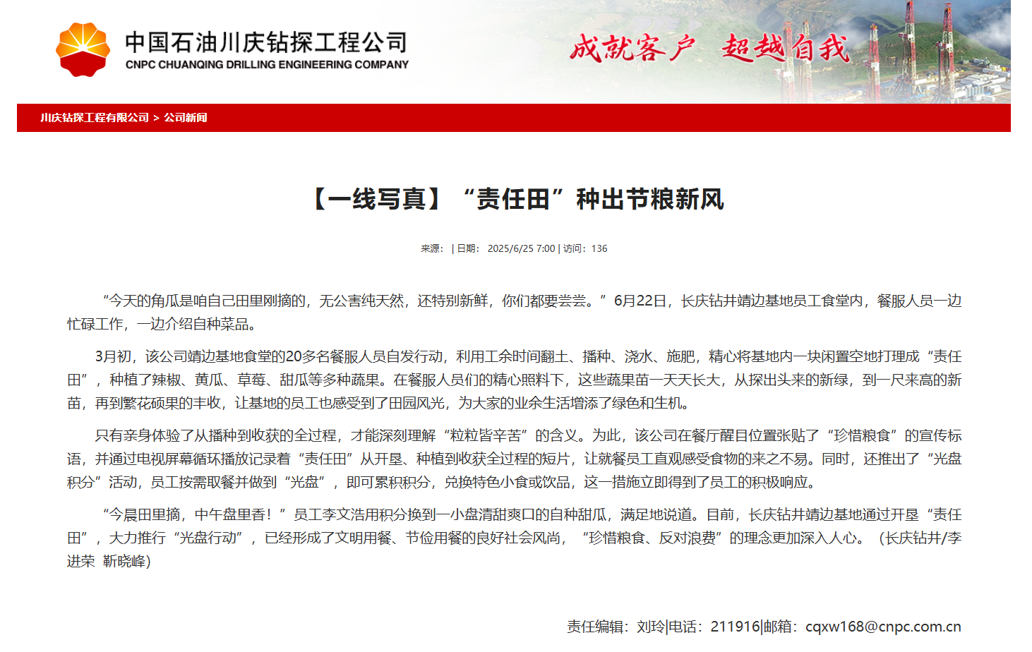 报道没有宏大的叙事,而是从员工食堂餐桌上的一盘“自种角瓜”细微处切入,巧妙地串联起了绿色生活、劳动教育、勤俭节约、家园文化等多个重要主题。这种“以小见大”的叙事方式,使得报道内容具体、生动、可感,避免了空洞的说教,更容易引发读者的共鸣。 “责任田”种出节粮新风