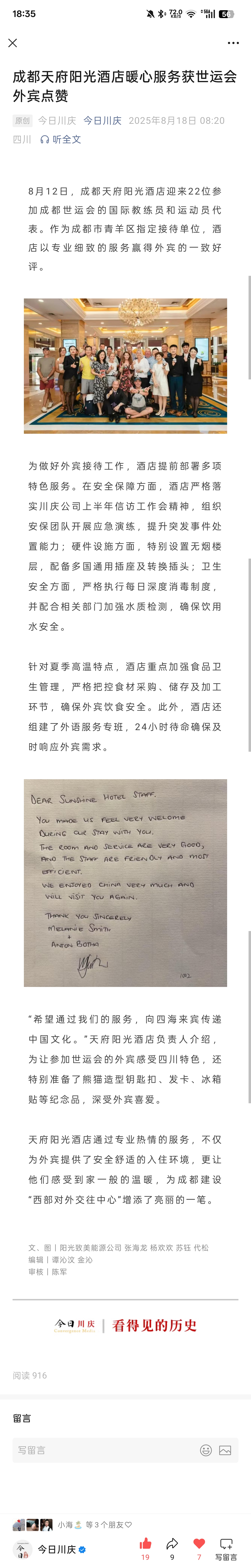 成都天府阳光酒店暖心服务获世运会外宾点赞