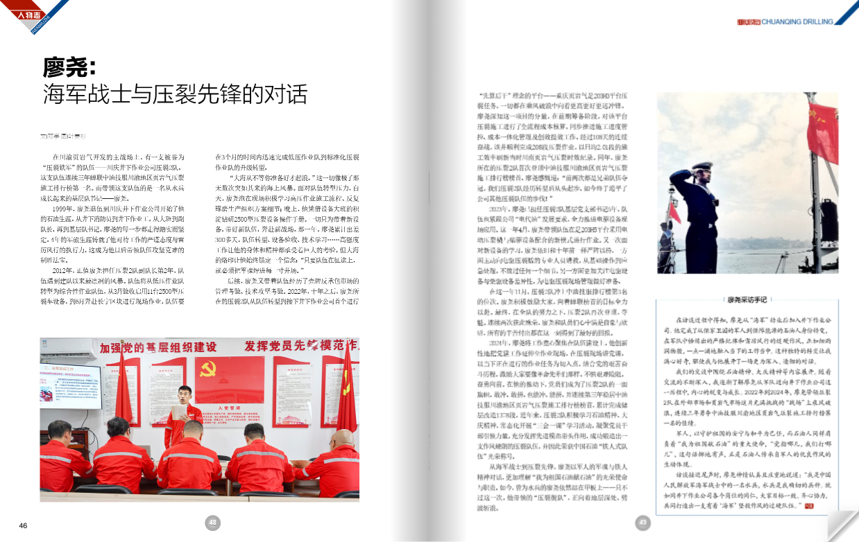 从海军战士到压裂先锋,廖尧以军人的军魂与铁人精神对话,更加理解“我为祖国石油献石油”的光荣使命与职责。如今,曾为水兵的廖尧依然站在甲板上——只不过这一次,他带领的“压裂舰队”,正向着地层深处,劈波斩浪。