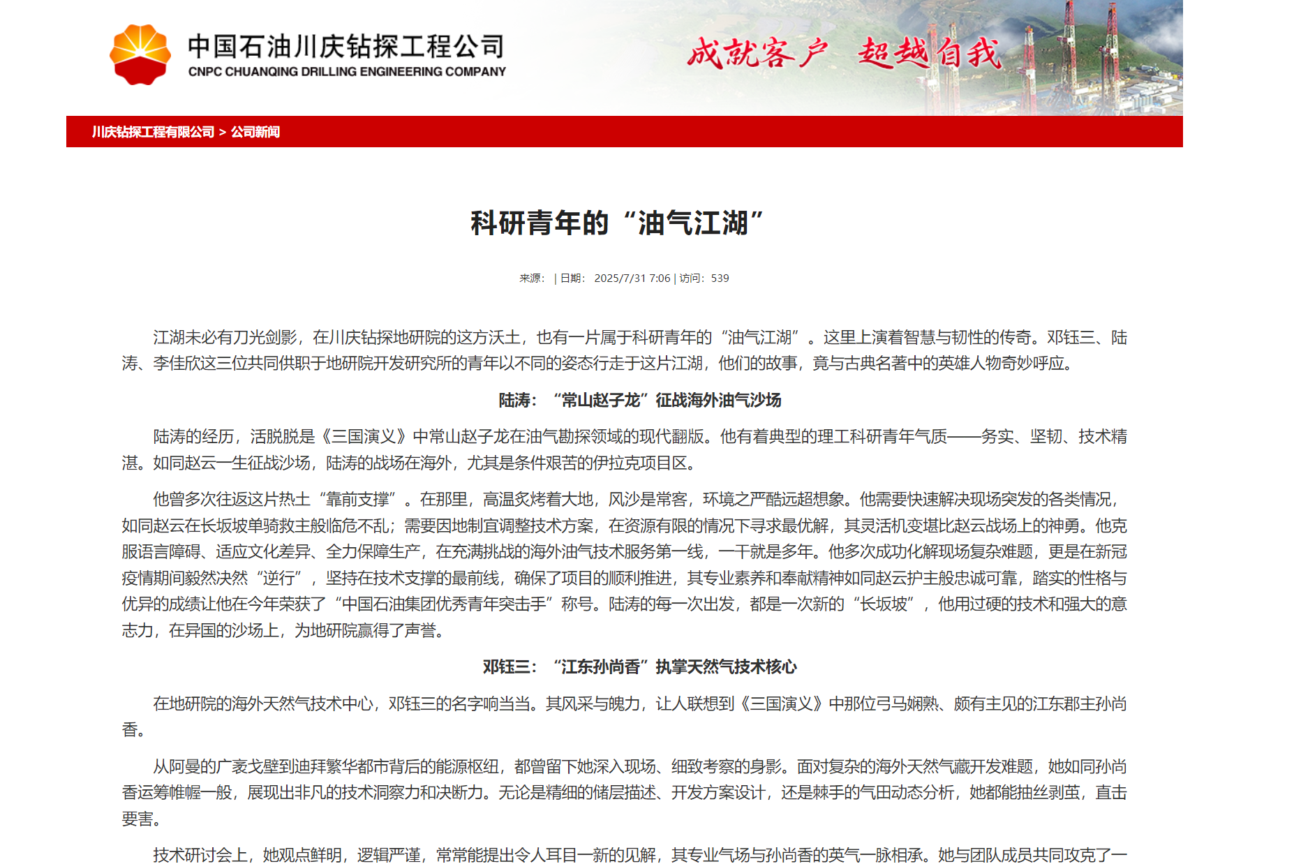 江湖未必有刀光剑影,在川庆钻探地研院的这方沃土,也有一片属于科研青年的“油气江湖”。这里上演着智慧与韧性的传奇。邓钰三、陆涛、李佳欣这三位共同供职于地研院开发研究所的青年以不同的姿态行走于这片江湖,他们的故事,竟与古典名著中的英雄人物奇妙呼应。