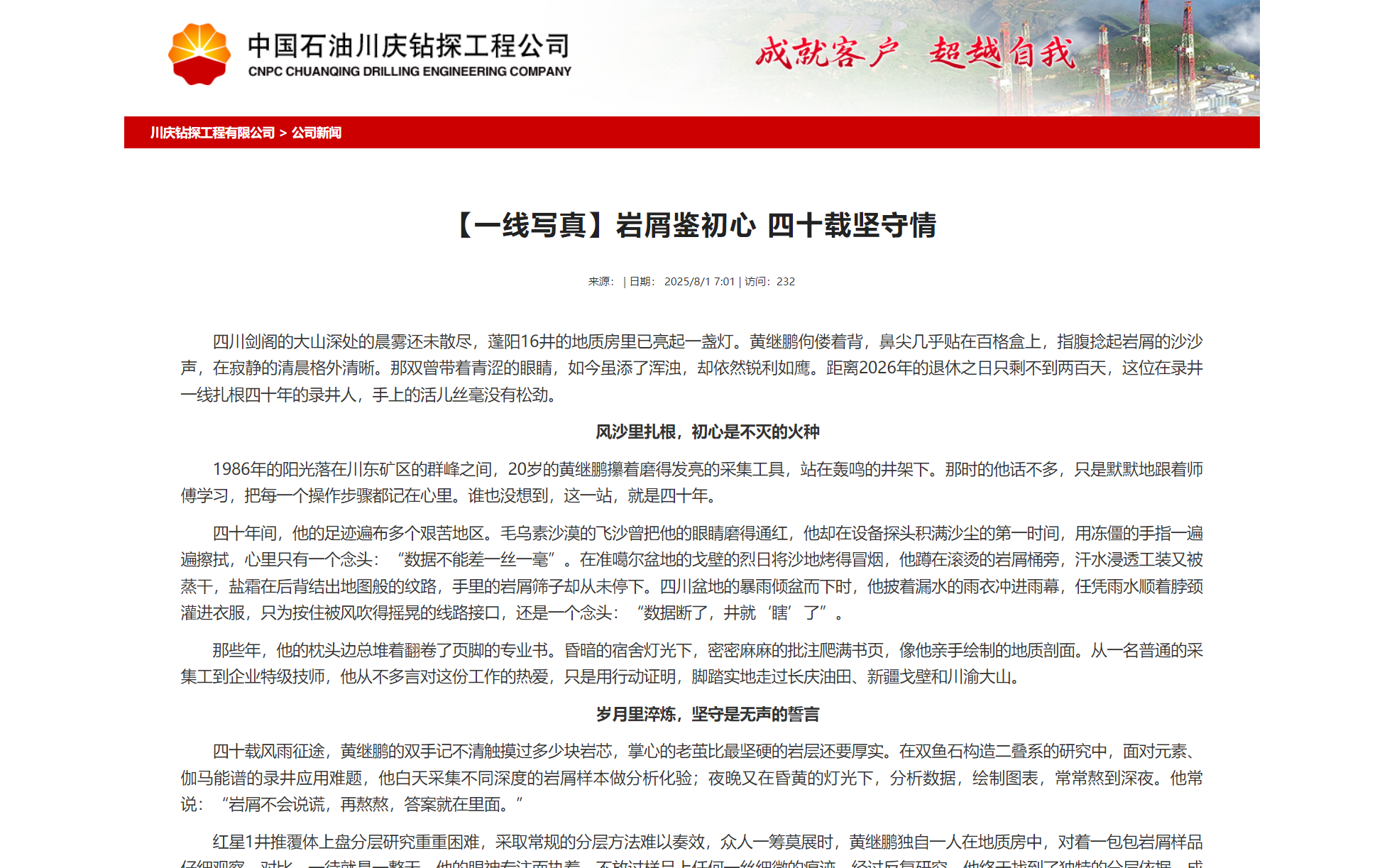 40年的时光,在他脸上刻下了深深的皱纹,双手也变得粗糙不堪。可他那颗对石油事业热爱的初心,却如同一颗璀璨的星辰,在岁月的长河中愈发闪耀。他用40年的坚守,尤其是这退休前最后的执着坚守,诠释了石油人的执着与担当。这最后的坚守,便是他初心最滚烫的注脚。(地研院/许磊 李璇)
