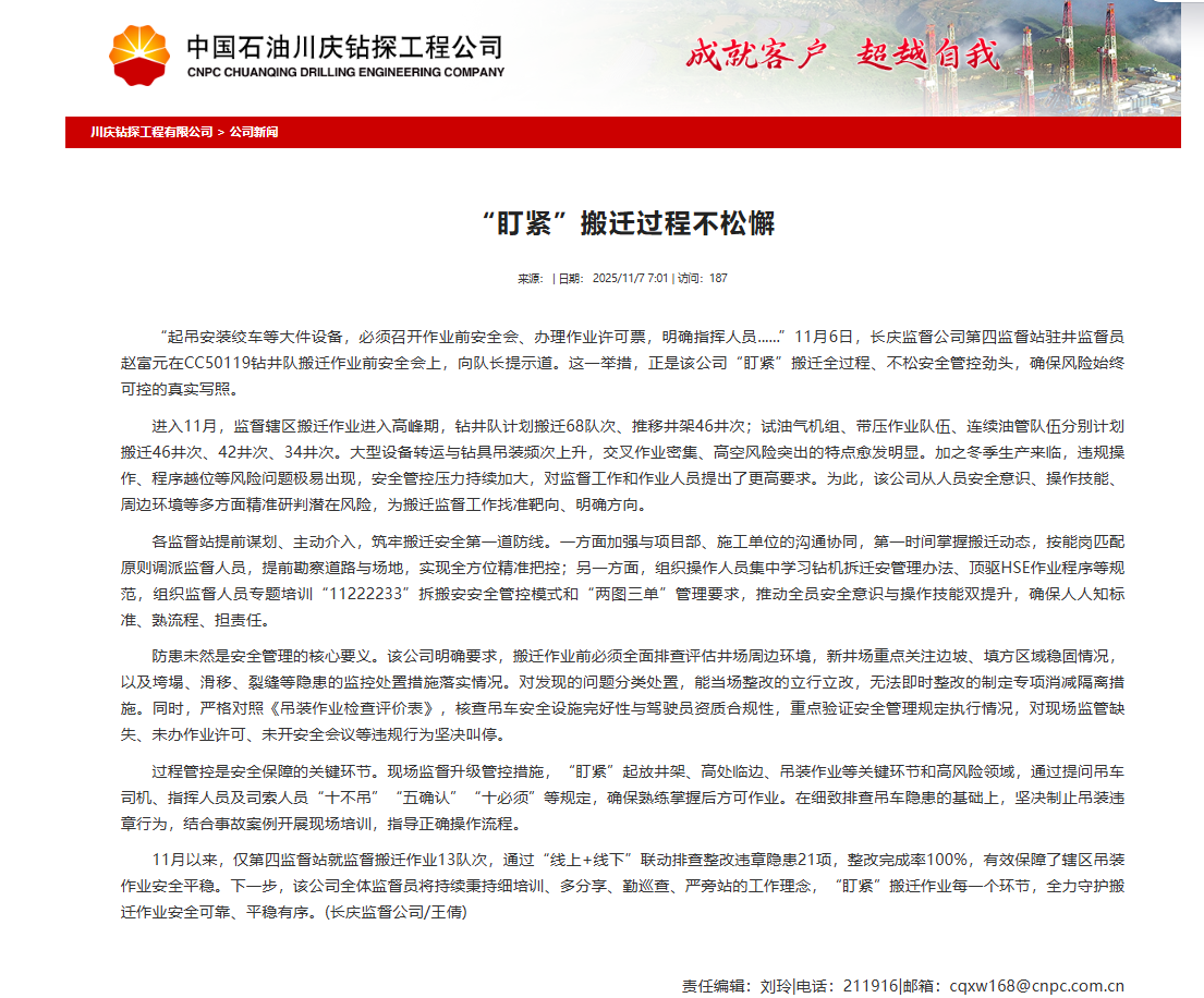 11月以来,仅第四监督站就监督搬迁作业13队次,通过“线上+线下”联动排查整改违章隐患21项,整改完成率100%,有效保障了辖区吊装作业安全平稳。下一步,该公司全体监督员将持续秉持细培训、多分享、勤巡查、严旁站的工作理念,“盯紧”搬迁作业每一个环节,全力守护搬迁作业安全可靠、平稳有序。(长庆监督公司/王倩)