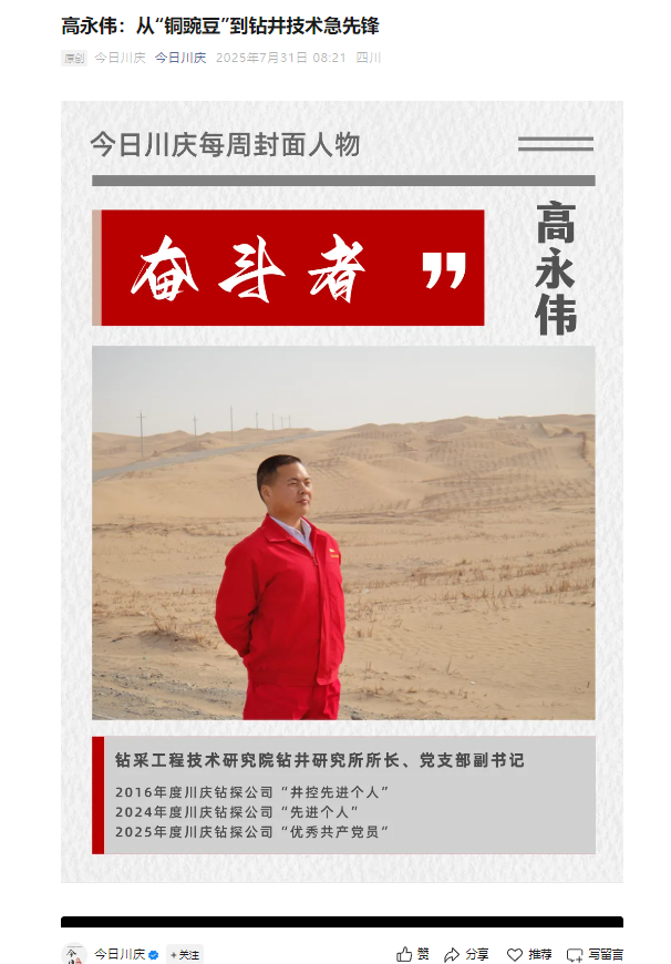 19年过去,高永伟的鬓角添了些许白发,但眼里的光仍如初见时明亮。从钻台到实验室,从黄土高坡到沙漠戈壁,他用脚步丈量过的井场路,最终都成了钻井技术突破的阶梯。这块在油气田里淬炼了19年的“钢”,早已把“我为祖国献石油”的铮铮誓言,融进了每一口井的深度里、每一项工具创新的温度里。