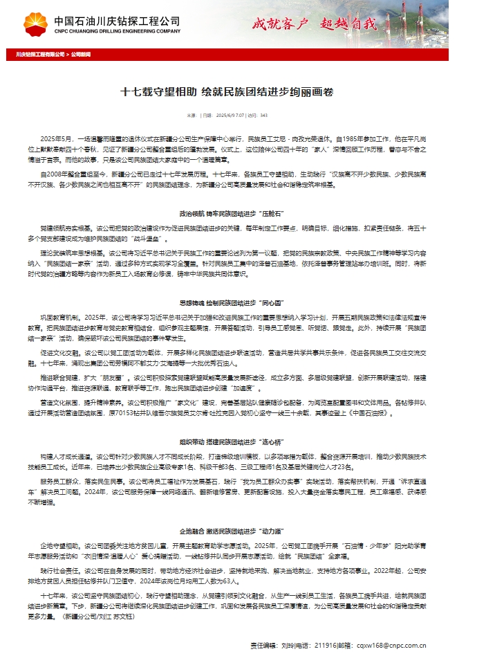 十七年来,该公司坚守民族团结初心,践行守望相助理念,从党建引领到文化融合,从生产一线到员工生活,各族员工携手共进,绘就民族团结进步新篇章。下步,新疆分公司将继续深化民族团结进步创建工作,巩固和发展各民族员工深厚情谊,为公司高质量发展和社会的和谐稳定贡献更多力量。(新疆分公司/刘江 苏文钰)
