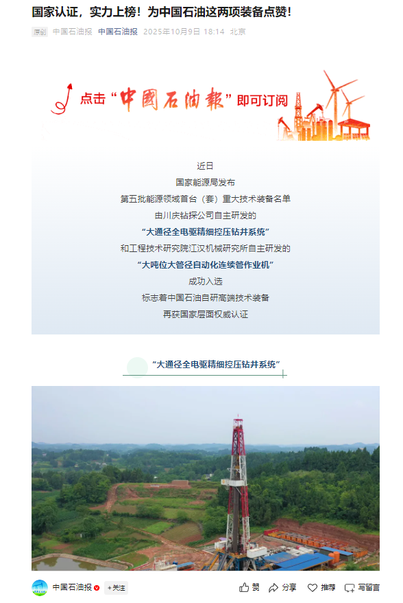 近日 国家能源局发布 第五批能源领域首台(套)重大技术装备名单 由川庆钻探公司自主研发的 “大通径全电驱精细控压钻井系统” 和工程技术研究院江汉机械研究所自主研发的 “大吨位大管径自动化连续管作业机” 成功入选 标志着中国石油自研高端技术装备 再获国家层面权威认证