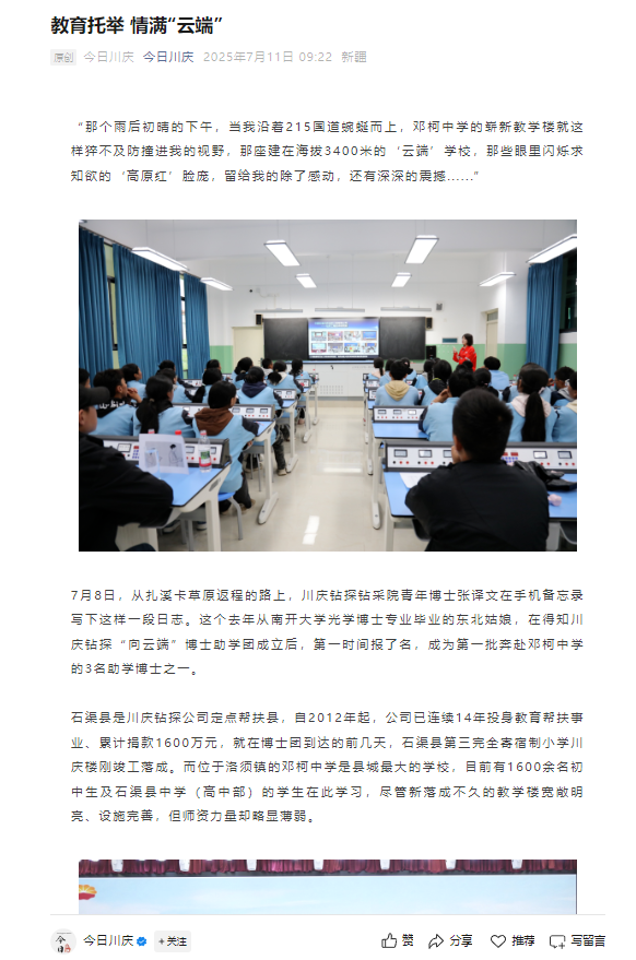 7月8日,从扎溪卡草原返程的路上,川庆钻探钻采院青年博士张译文在手机备忘录写下这样一段日志。这个去年从南开大学光学博士专业毕业的东北姑娘,在得知川庆钻探“向云端”博士助学团成立后,第一时间报了名,成为第一批奔赴邓柯中学的3名助学博士之一。