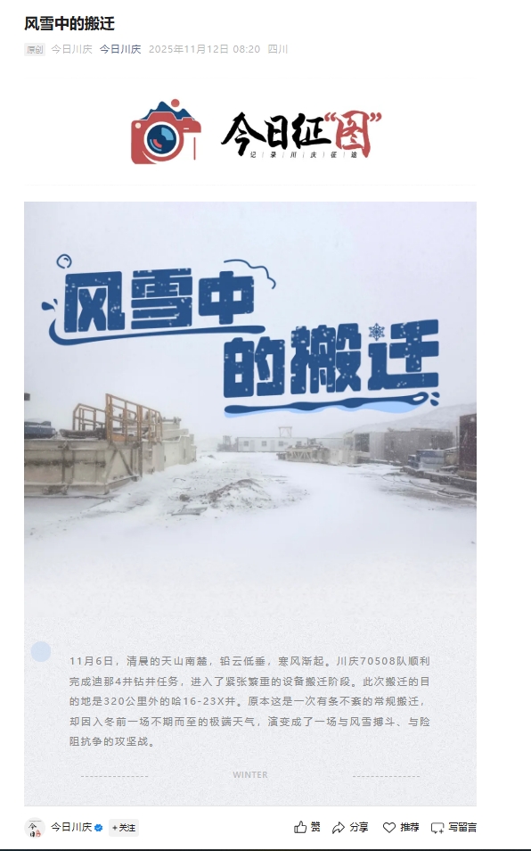 11月6日,清晨的天山南麓,铅云低垂,寒风渐起。川庆70508队顺利完成迪那4井钻井任务,进入了紧张繁重的设备搬迁阶段。此次搬迁的目的地是320公里外的哈16-23X井。原本这是一次有条不紊的常规搬迁,却因入冬前一场不期而至的极端天气,演变成了一场与风雪搏斗、与险阻抗争的攻坚战。