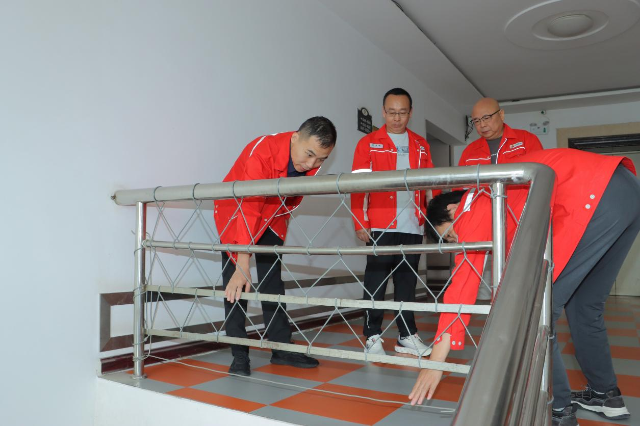 会后,项目部迅速组织由质量安全办公室、基地管理及物业人员组成的联合检查组,在基地内展开了一场“地毯式”安全大扫除。 “这个楼梯转角处护栏间隙有点大,需要加密!”“这间房的窗户限位器要检查是否有效!”检查组紧盯儿童可能触及的每个角落——从房间阳台门窗锁闭、活动室设施稳固,到公共区域消防器材、疏散通道畅通,不放过任何蛛丝马迹。对于发现的问题,现场能整改的立即动手,需要协调的明确责任人和时限,确保隐患及时清零。