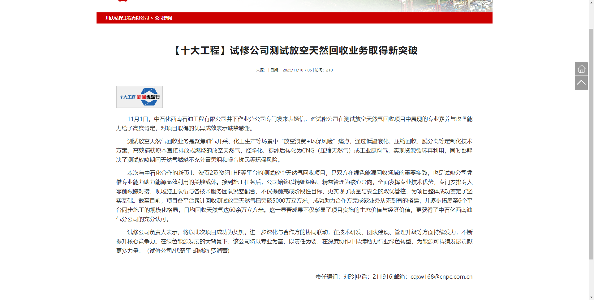 该报道以试修公司获中石化西南石油工程有限公司井下作业分公司表扬信为切入点,生动展现测试放空天然气回收业务的技术实力。采编团队记录测试放空天然气回收项目作业过程、挖掘天然气回收作业的技术亮点。刊发后引发行业广泛关注,为后续天然气回收业务绿色开发营造了良好舆论氛围。 11月1日,中石化西南石油工程有限公司井下作业分公司专门发来表扬信,对试修公司在测试放空天然气回收项目中展现的专业素养与攻坚能力给予高度肯定,对项目取得的优异成效表示诚挚感谢。