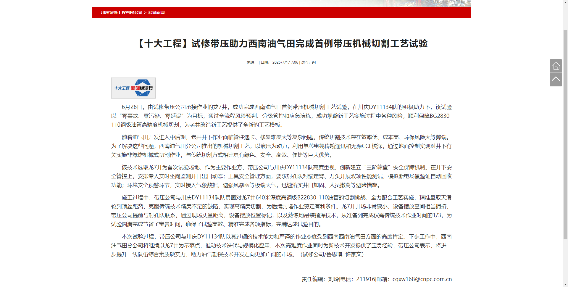 6月26日,由试修带压公司承接作业的龙7井,成功完成西南油气田首例带压机械切割工艺试验,在川庆DY11134队的积极助力下,该试验以“零事故、零污染、零延误”为目标,通过全流程风险预判、分级管控和应急演练,成功规避新工艺实施过程中各种风险,顺利保障BG2830-110钢级油管高精度机械切割,为老井改造新工艺提供了全新的工艺模板。