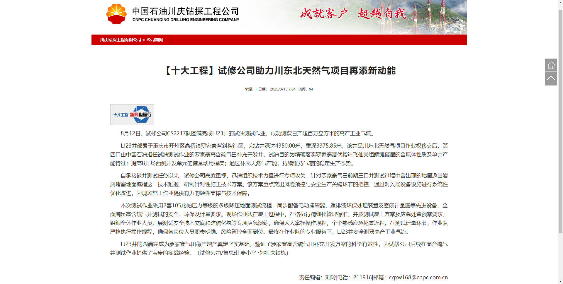 本次报道聚焦LJ23井试油测试作业,因其在川东北天然气项目再获突破而重点采写。刊发后在业内引发热烈反响,LJ23井成功测获百万高产获高度评价,为罗家寨气田稳产增产奠定坚实基础,验证了罗家寨高含硫气田补充开发方案的科学有效性,为试修公司后续在高含硫气井测试作业提供了宝贵的实战经验。 8月12日,试修公司CS2217队圆满完成LJ23井的试油测试作业,成功测获日产超百万立方米的高产工业气流。
