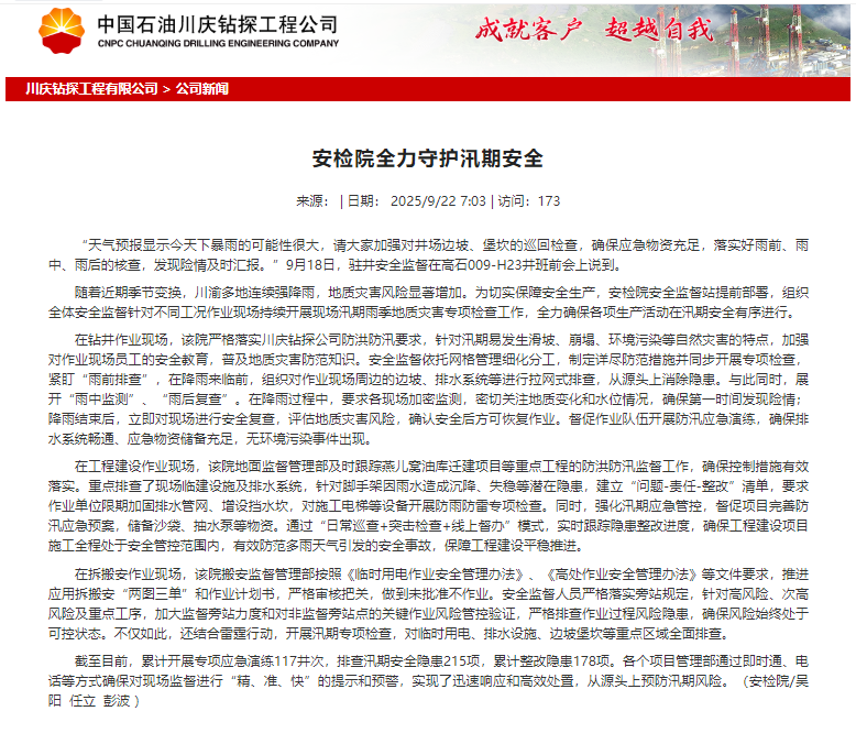 在钻井作业现场,该院严格落实川庆钻探公司防洪防汛要求,针对汛期易发生滑坡、崩塌、环境污染等自然灾害的特点,加强对作业现场员工的安全教育,普及地质灾害防范知识。安全监督依托网格管理细化分工,制定详尽防范措施并同步开展专项检查,紧盯“雨前排查”,在降雨来临前,组织对作业现场周边的边坡、排水系统等进行拉网式排查,从源头上消除隐患。与此同时,展开“雨中监测”、“雨后复查”。在降雨过程中,要求各现场加密监测,密切关注地质变化和水位情况,确保第一时间发现险情;降雨结束后,立即对现场进行安全复查,评估地质灾害风险,确认安全后方可恢复作业。督促作业队伍开展防汛应急演练,确保排水系统畅通、应急物资储备充足,无环境污染事件出现。